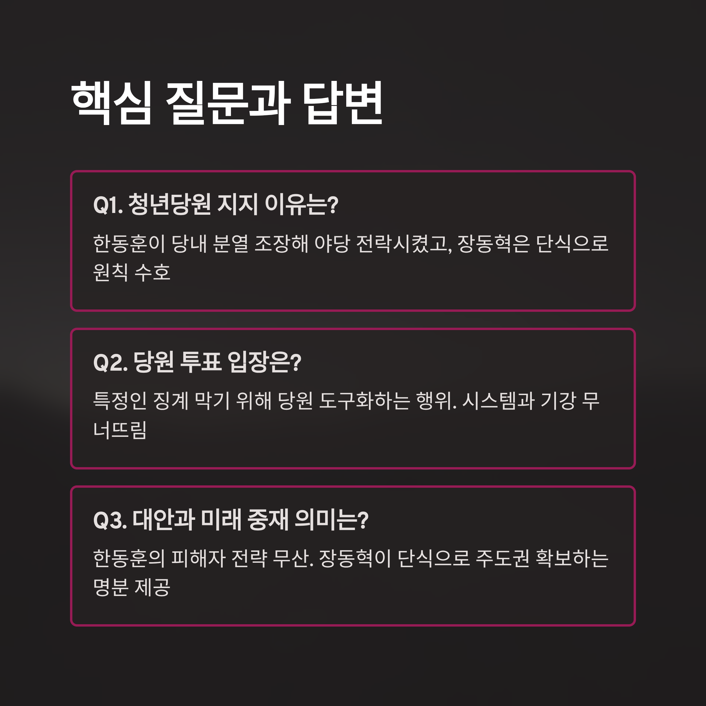 | Q1. 청년 당원과 책임 당원들이 장동혁 대표를 공개 지지하는 이유는 무엇인가요? |