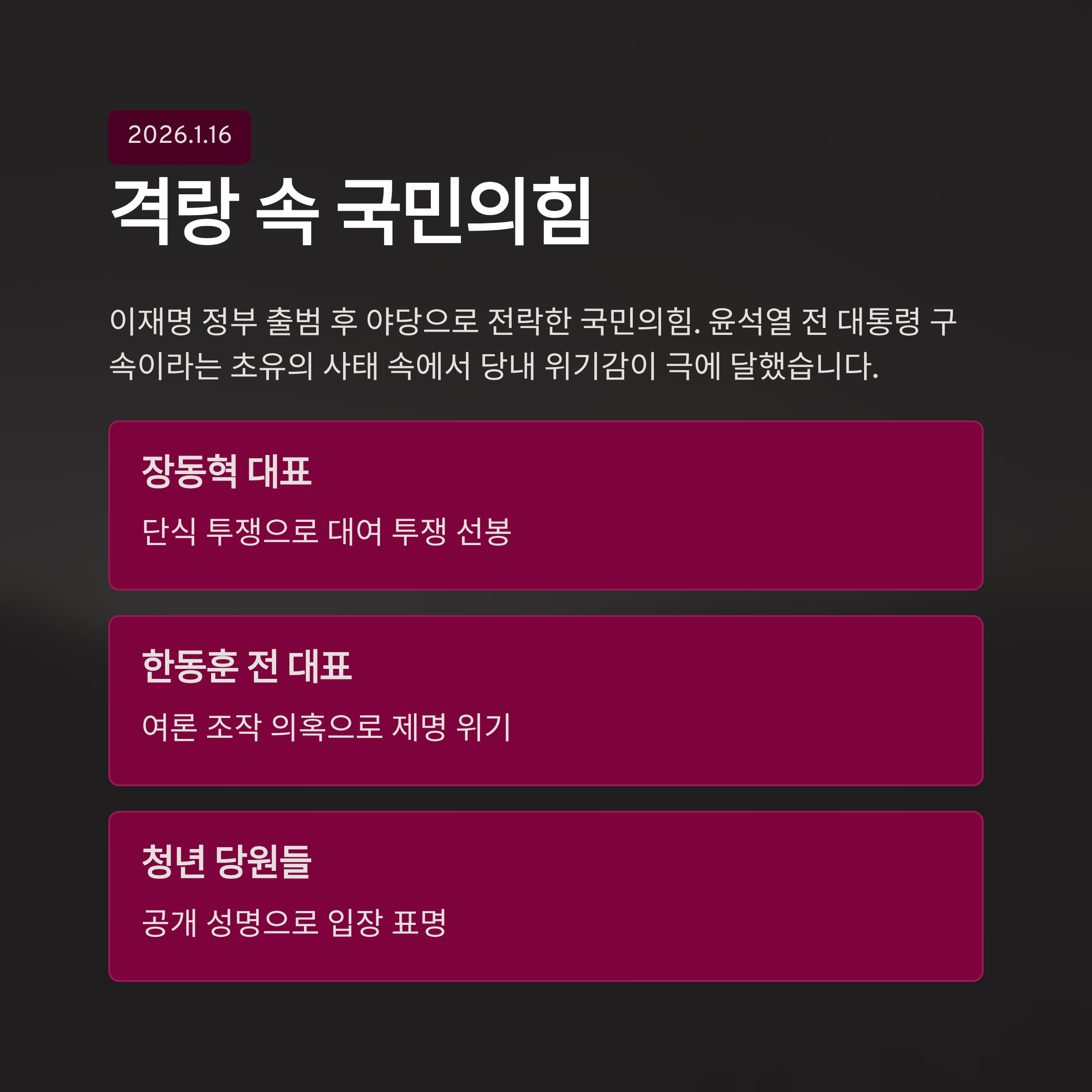2026년 1월 16일, 대한민국 정치권은 격랑 속에 있습니다. 이재명 정부 출범 이후 국민의힘은 야당으로 전락했고, 윤석열 전 대통령이 구속 및 사형 구형이라는 초유의 사태를 맞이하며 당내 위기감이 극에 달해 있습니다. 이러한 상황에서 국민의힘 장동혁 대표는 더불어민주당의 각종 특검 공세에 맞서 단식 투쟁을 벌이며 대여 투쟁의 선봉에 서 있습니다.