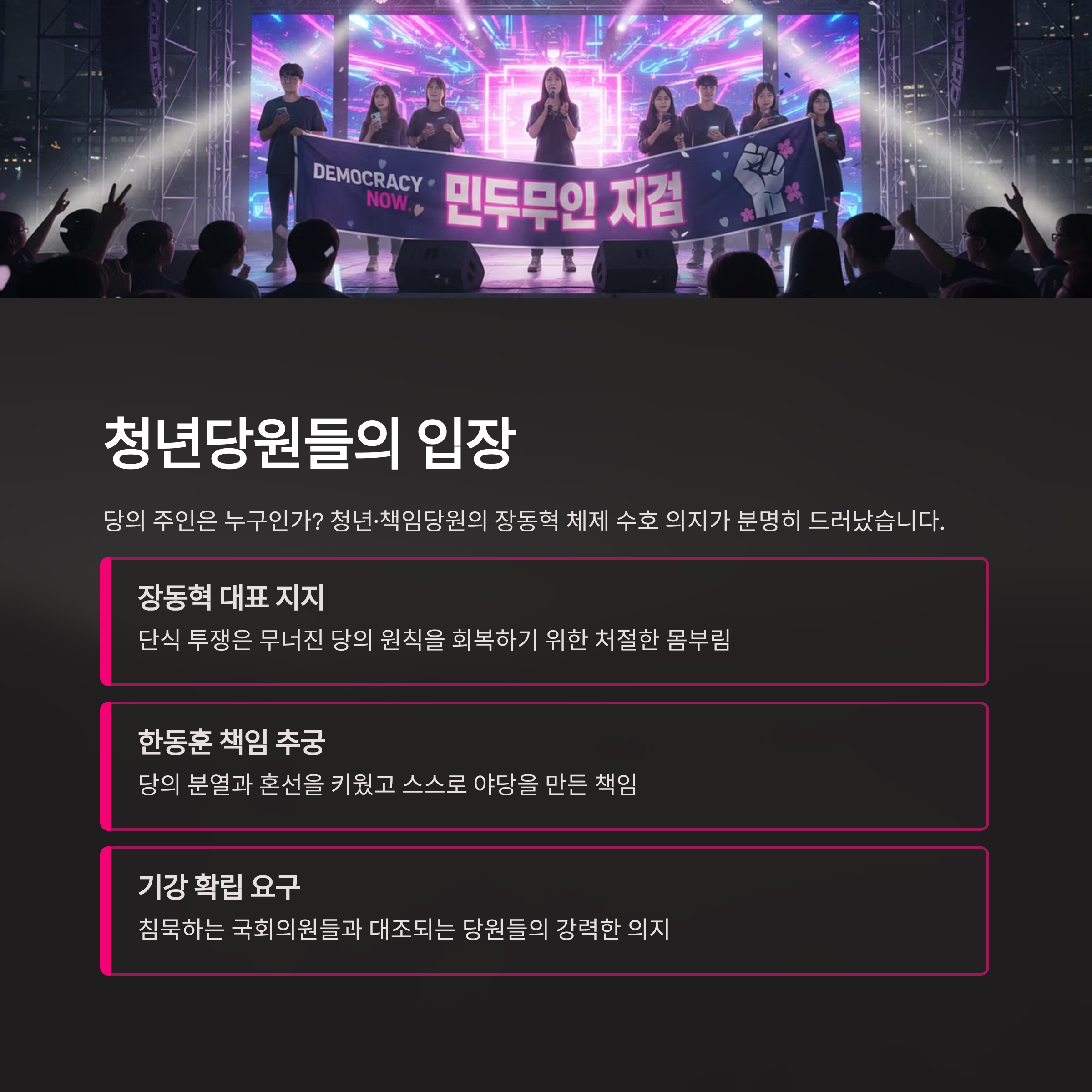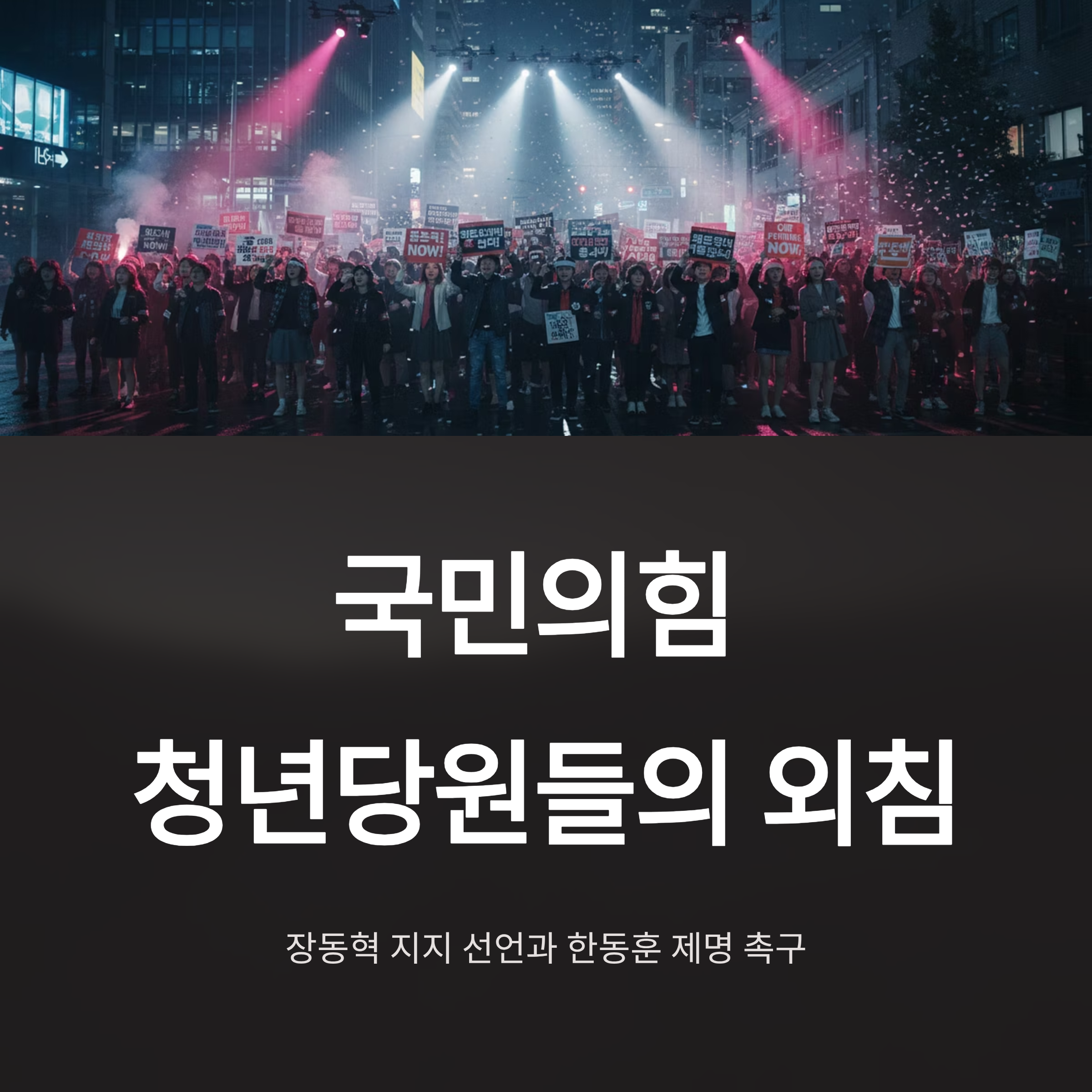 국민의힘 내부에서 한동훈 전 대표의 당원 게시판 여론 조작 의혹과 징계 절차를 둘러싼 갈등이 증폭되는 가운데, 청년 및 책임 당원들이 성명서를 통해 장동혁 대표의 지도부를 전폭 지지한다고 선언했습니다.