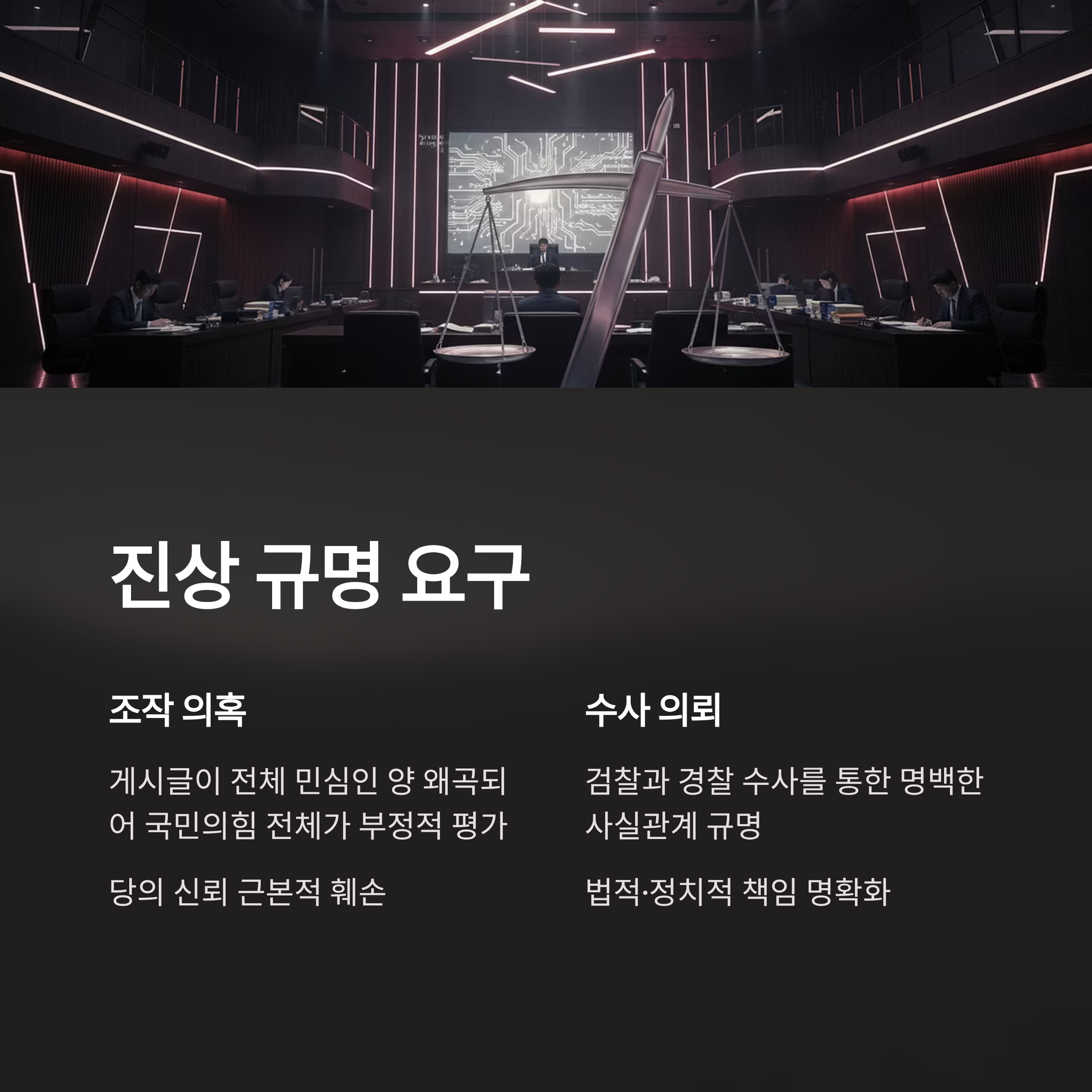 또한, 이들은 당원 게시판 사건에 대한 철저한 진상 규명을 요구하고 있습니다. 한 전 대표 측이 제기하는 '조작설'에 맞서, 필요하다면 검찰과 경찰에 수사를 의뢰해서라도 명백한 사실관계를 밝혀야 한다고 목소리를 높입니다. 게시글이 마치 전체 민심인 양 왜곡되어 외부에 전달됨으로써 국민의힘 전체가 부정적인 평가를 받게 된 상황을 더 이상 방치할 수 없다는 위기감이 깔려 있습니다. 이는 당의 시스템이 특정 개인의 정치적 목적을 위해 유용되는 것을 막고, 공당으로서의 기강을 확립해야 한다는 당원들의 절박한 요구로 해석됩니다.