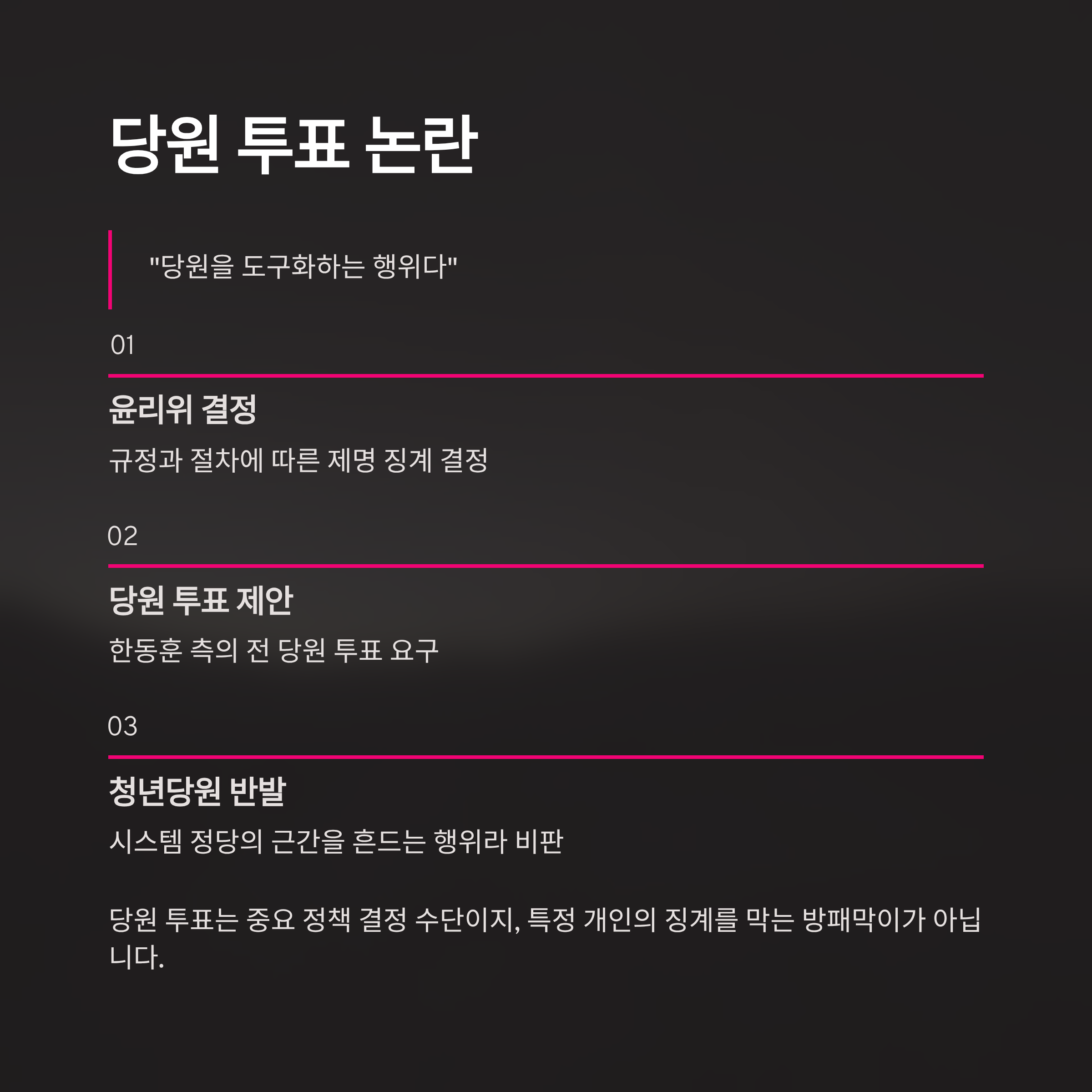 한동훈 전 대표 측과 일부 당직자들이 제기한 '전 당원 투표' 제안에 대해 청년 당원들은 이를 '당원을 도구화하는 행위'라며 강력히 비판하고 있습니다. 윤리위원회가 이미 규정과 절차에 따라 '제명'이라는 징계 결정을 내린 상황에서, 이를 뒤집기 위해 인기투표 성격의 당원 투표를 끌어들이는 것은 시스템 정당의 근간을 흔드는 행위라는 것입니다. 당원 투표는 당의 중요한 정책이나 진로를 결정할 때 사용되는 제도이지, 특정 개인의 징계를 막기 위한 방패막이로 사용되어서는 안 된다는 것이 이들의 주장입니다.