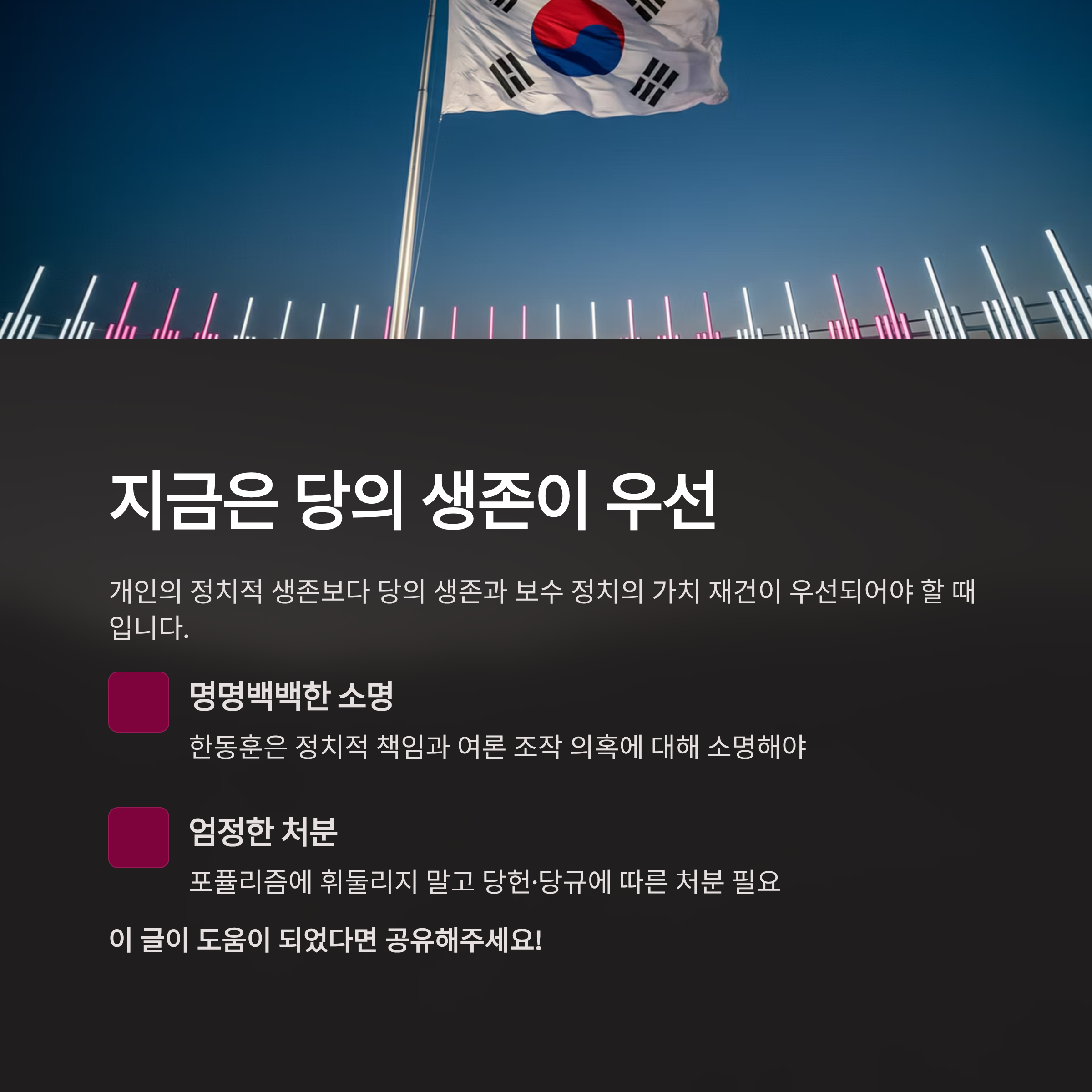 한동훈 전 대표는 집권 여당을 분열시켜 야당으로 전락시킨 정치적 책임과 당원 게시판 여론 조작 의혹에 대해 당원들 앞에 명명백백히 소명해야 합니다. 또한, 국민의힘 지도부는 당원 투표라는 포퓰리즘적 수단에 휘둘리지 말고, 당헌·당규에 입각한 엄정한 처분을 통해 당의 질서를 회복해야 할 것입니다. 지금은 개인의 정치적 생존보다 당의 생존과 보수 정치의 가치 재건이 우선되어야 할 때입니다.
