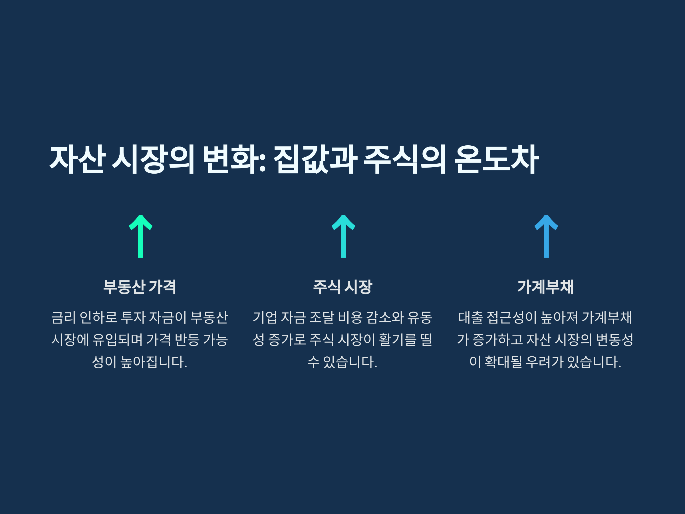 금리 인하는 투자 자금의 흐름에도 큰 영향을 줍니다. 은행 예금 수익률이 낮아지면 상대적으로 높은 수익을 추구하는 자금이 부동산이나 주식 시장으로 유입되며, 가격 상승을 유도할 수 있습니다. 특히 1주택 실수요자나 전세입자들에게는 부동산 가격 변동성이 중요한 변수로 작용합니다.