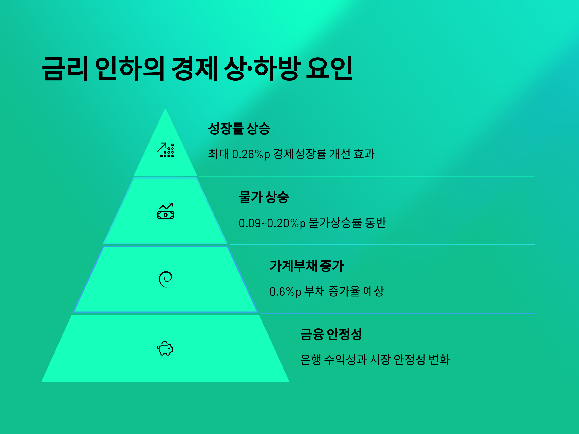 하지만 주의할 점도 있습니다. 기준금리는 즉각 반영되기 어렵고, 은행별 가산금리 구조에 따라 체감 효과가 달라질 수 있습니다. 또한 금리 인하를 기회 삼아 새로운 대출을 받거나, 기존 대출을 늘리는 과도한 레버리지 전략은 금리가 다시 오를 경우 더 큰 부담으로 돌아올 수 있습니다.
