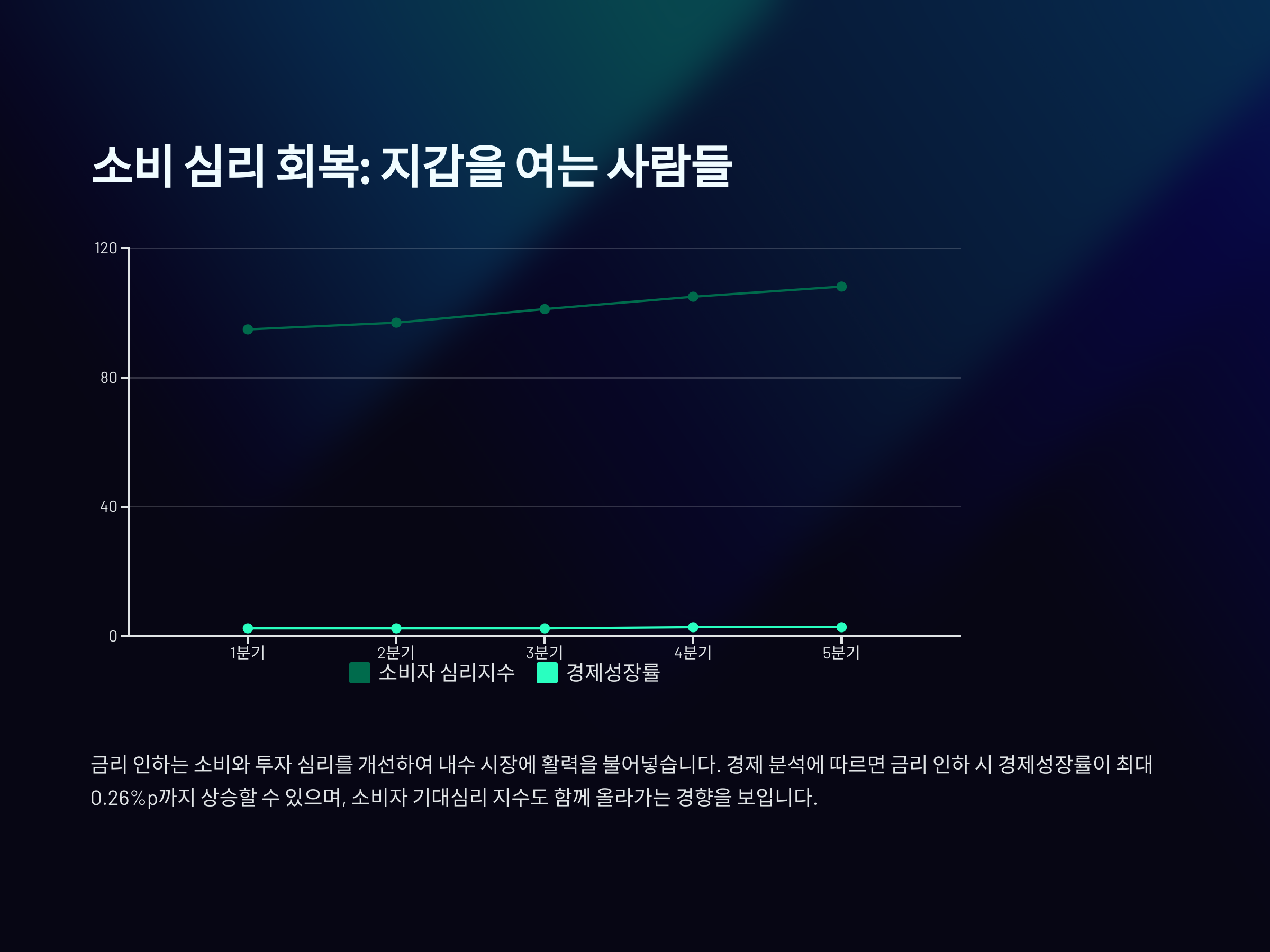 금리 인하는 일반 소비자들의 지갑을 열게 만드는 효과를 가지고 있습니다. 이자 부담이 줄어들고, 심리적으로도 '경기가 좋아질 것'이라는 기대가 확산되면서 외식, 여행, 쇼핑 등 소비 지출이 증가합니다. 소비는 다시 내수 경기 활성화로 이어지는 선순환을 만들 수 있습니다.