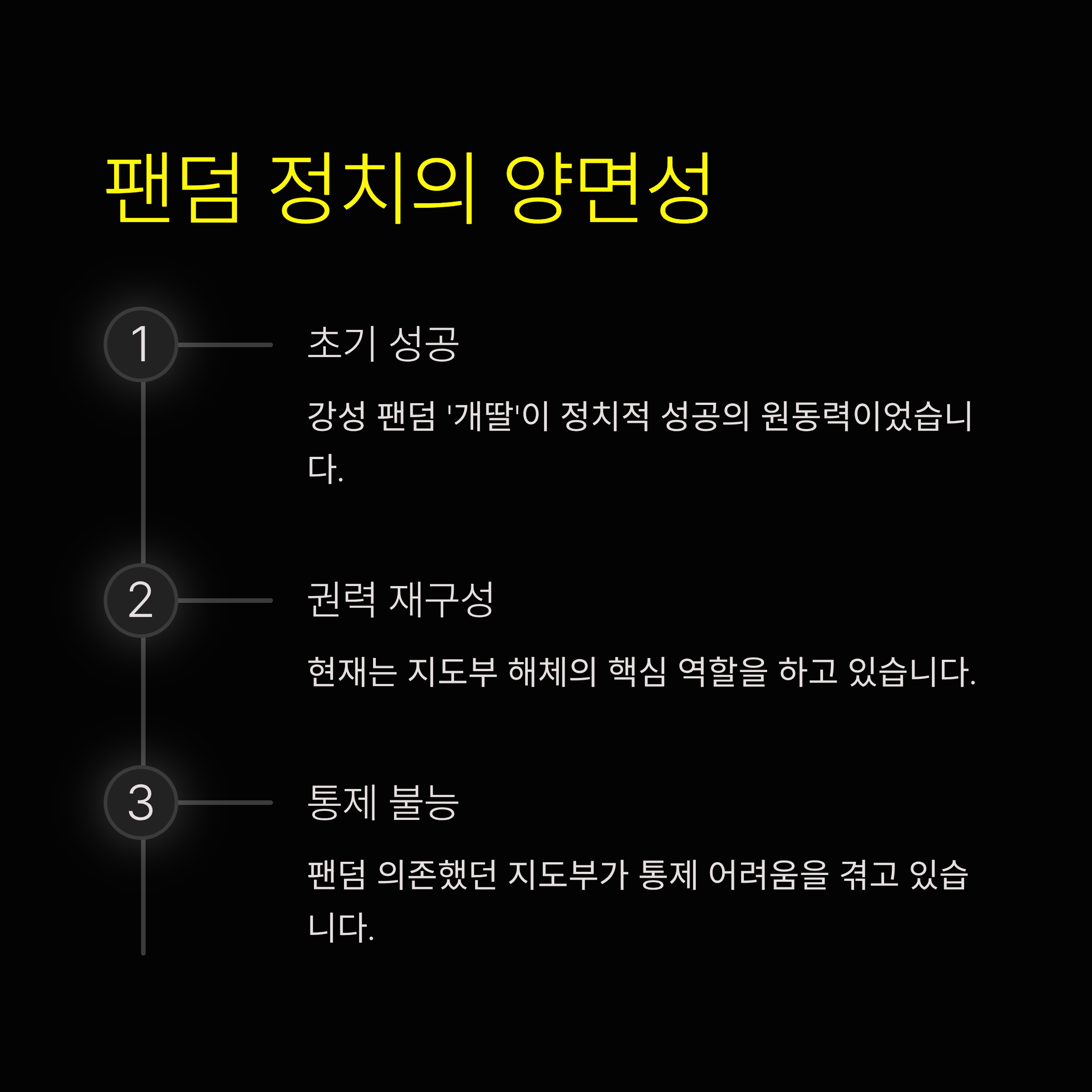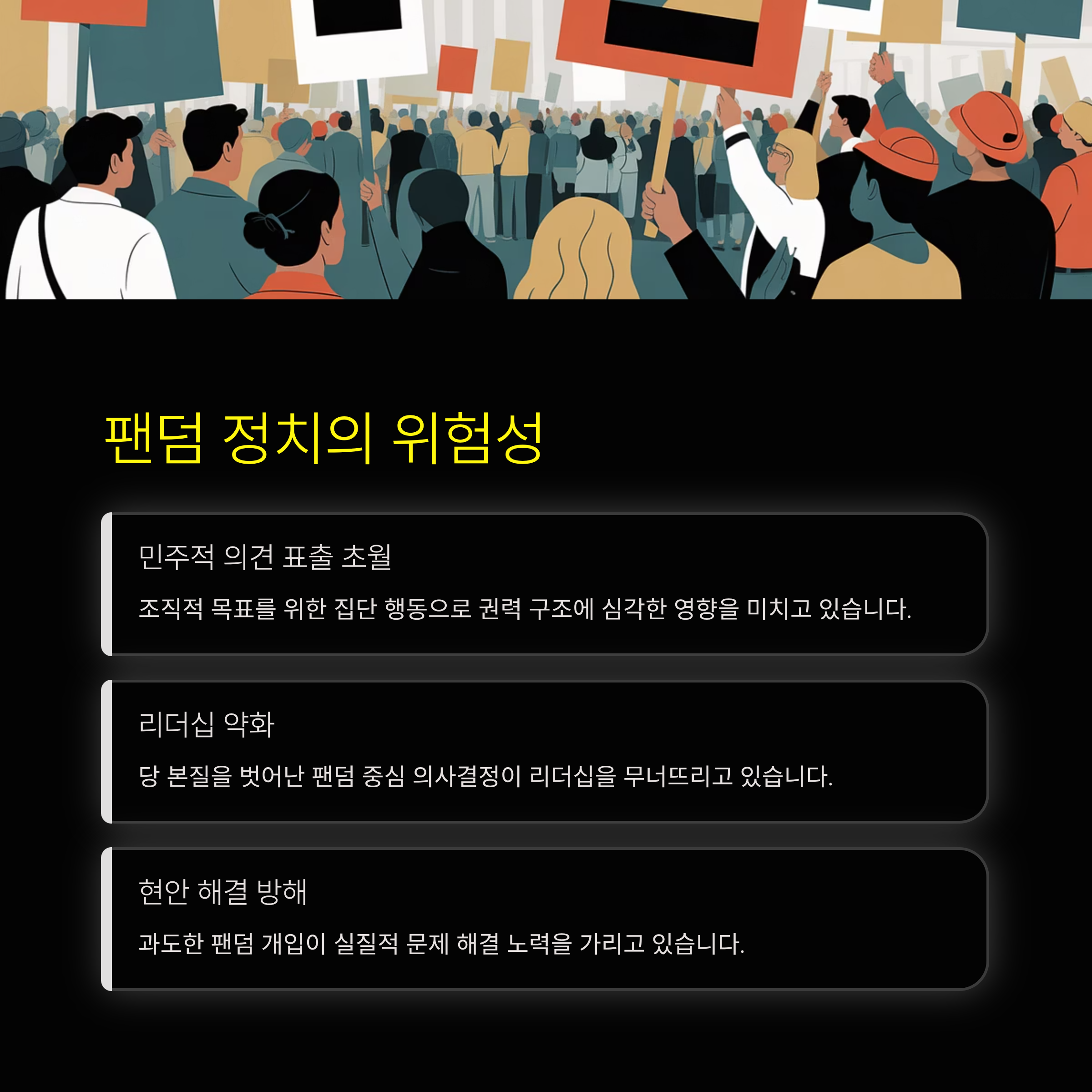 4. 팬덤 정치의 양면성이 드러나며, 과도한 팬덤 개입이 민주당 내부 질서에 도전을 가하고 있습니다.