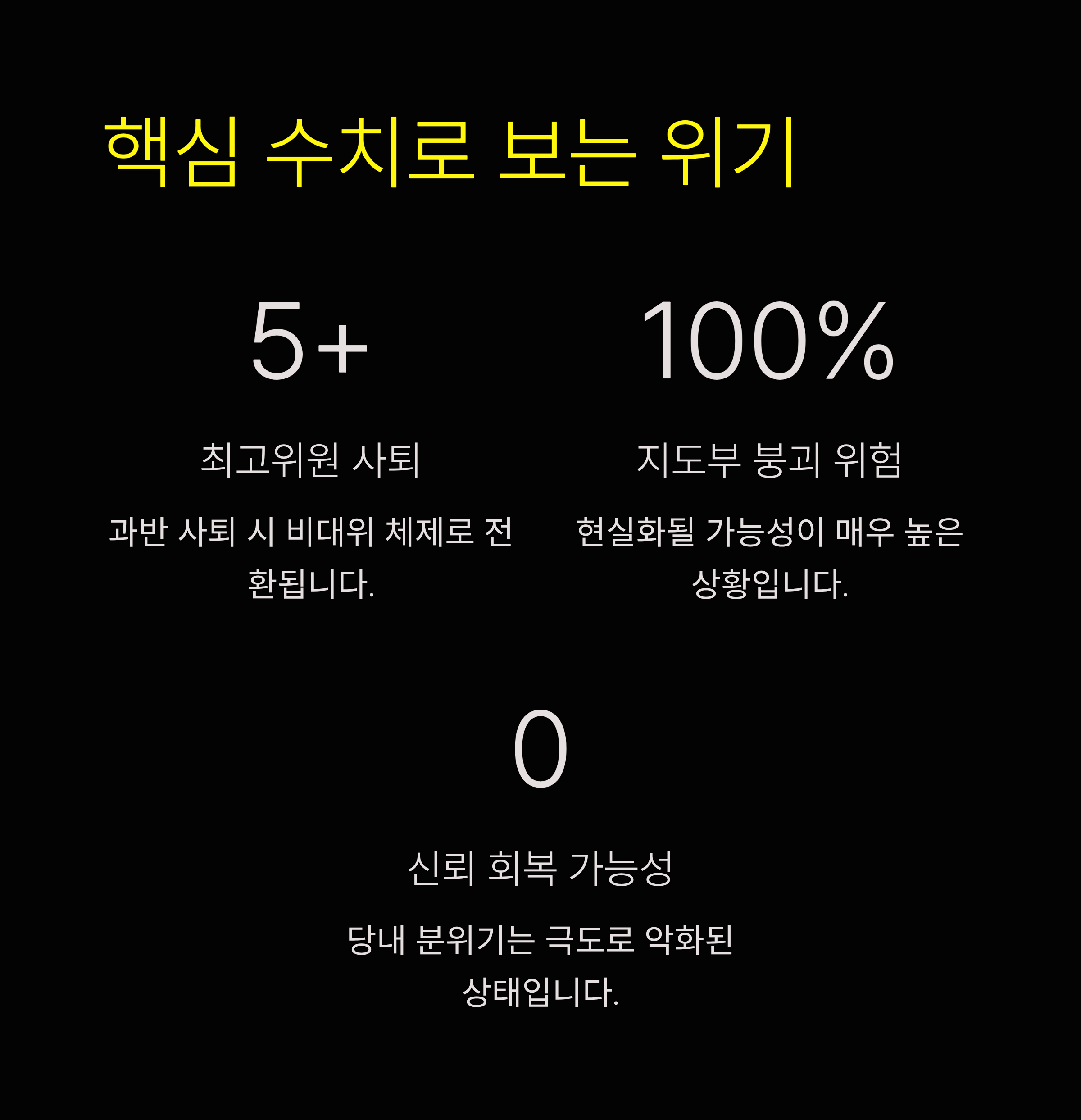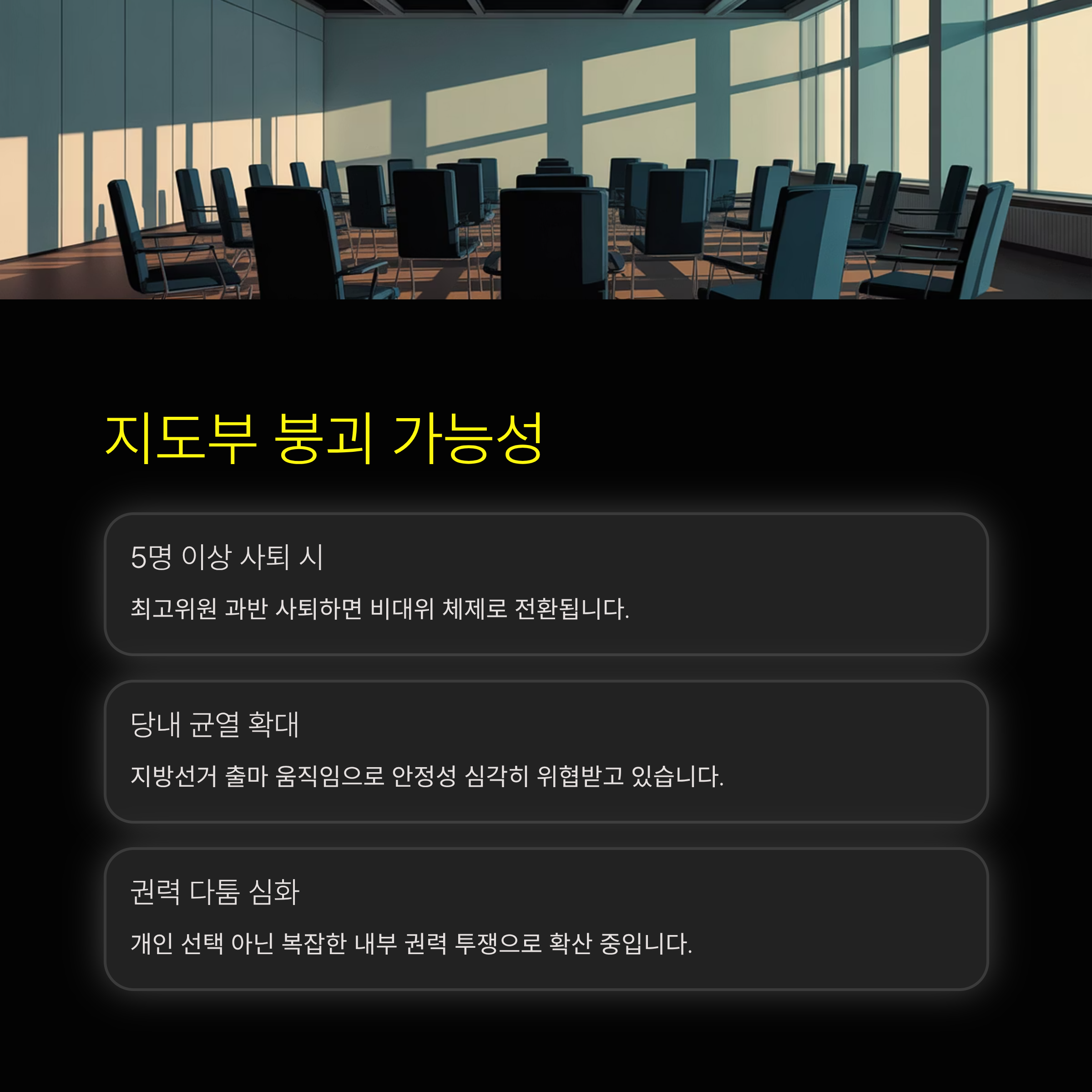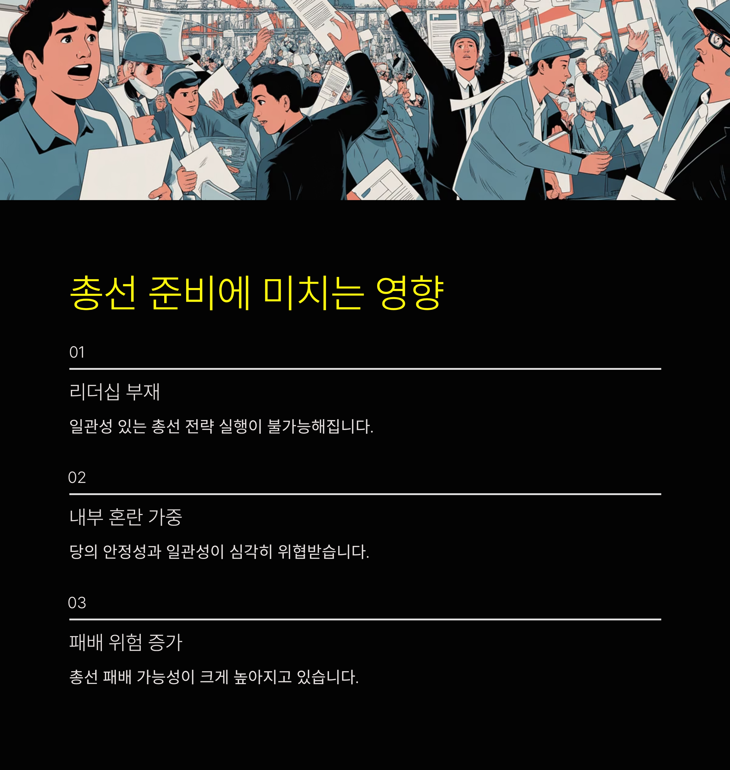 5. 지도부 붕괴는 총선 준비와 당의 일관성에 부정적 영향을 줄 가능성이 높습니다.