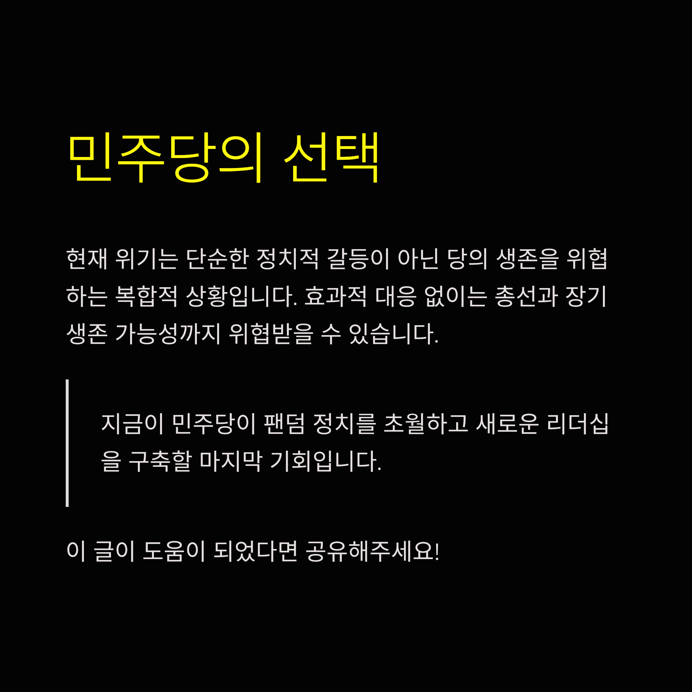지도부는 단기적으로는 팬덤과 출마 선언을 조율하고, 신뢰를 회복하기 위한 세밀한 조치를 취하는 것이 필요합니다. 중장기적으로는 팬덤 정치의 한계를 인식하고 이를 초월할 수 있는 새로운 리더십 모델을 구축해야 합니다. 이를 통해 민주당이 현재의 복잡한 양상을 극복하고, 내부 갈등을 조정하는 한편, 안정적이고 단단한 당의 미래를 준비할 수 있을 것입니다.
