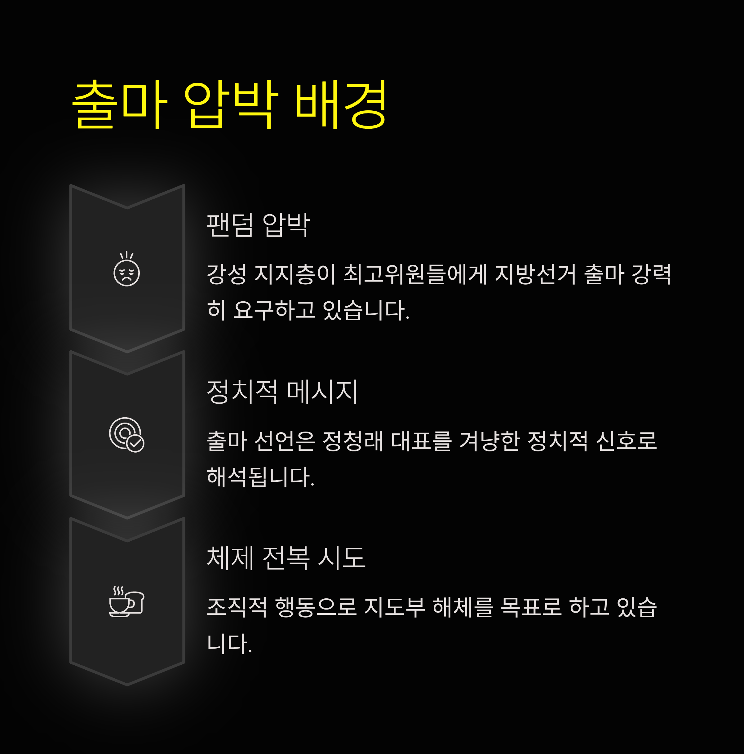 정청래 대표를 지지했던 강성 팬덤 ‘개딸’은 초기에 그의 정치적 성공을 이끌었던 주요 원동력이었으나, 현재는 오히려 지도부 해체와 권력 재구성의 핵심 역할을 하고 있습니다. 이 팬덤은 최고위원들에게 지방 선거 출마를 강력히 압박하며 지도부 체제 전복을 시도하고 있는 것으로 보입니다. 이는 단순한 민주적 의견 표출이 아니라, 특정 조직적 목표를 위한 집단적 행동이라는 점에서 민주당 내 권력 구조에 심각한 영향을 미치고 있습니다.