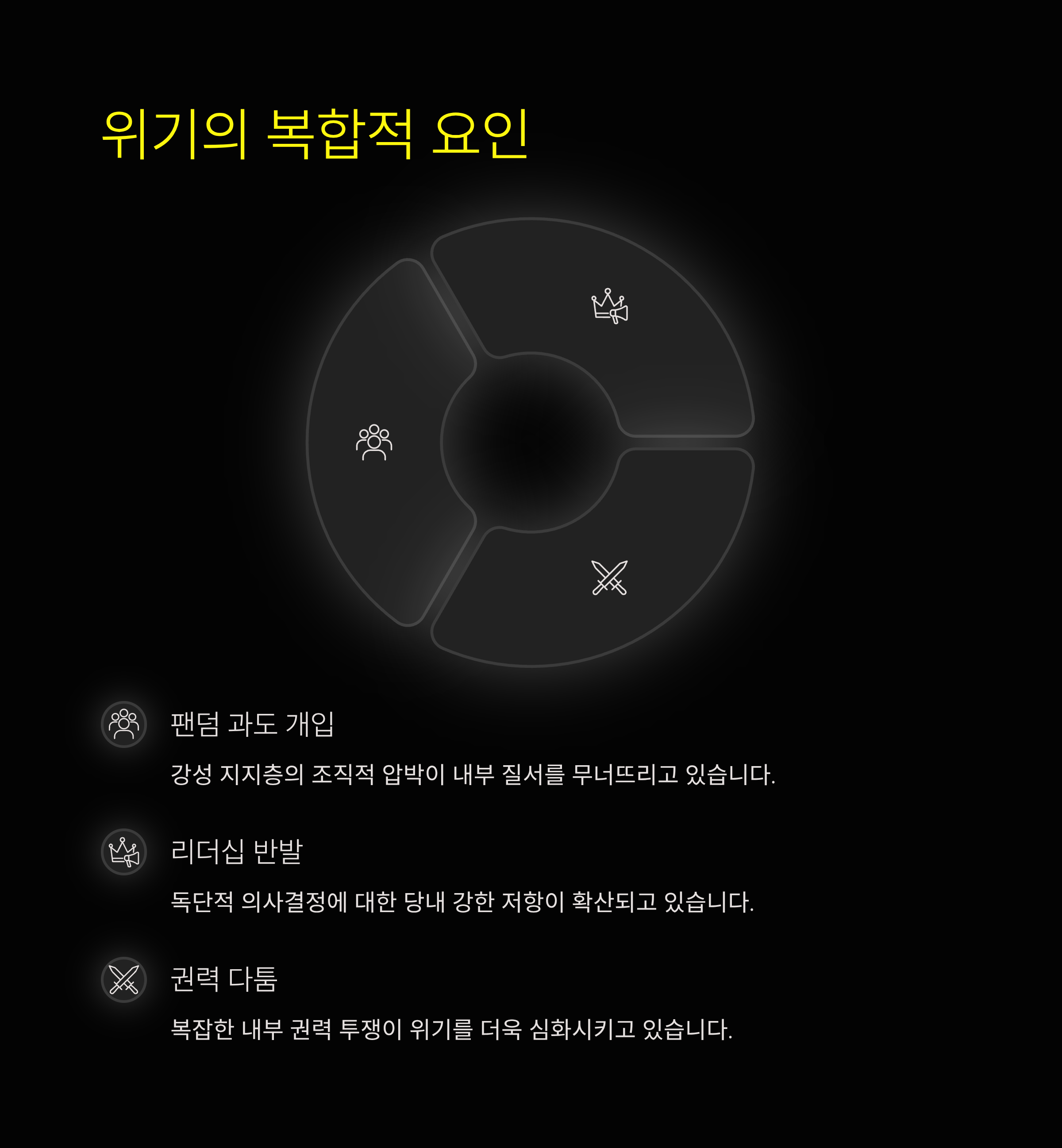 팬덤 정치는 지지와 비판이라는 양날의 검을 지니고 있습니다. 당의 본질을 벗어난 팬덤 중심의 의사 결정은 당내 리더십을 약화시킬 뿐만 아니라, 현안 문제를 해결하려는 실질적 노력마저 가리고 있습니다. 특히, 정청래 지도부 역시 초기에 팬덤의 힘을 크게 의존했던 만큼, 현재 상황에서 이를 통제하는 데 어려움을 겪고 있는 것으로 분석됩니다.