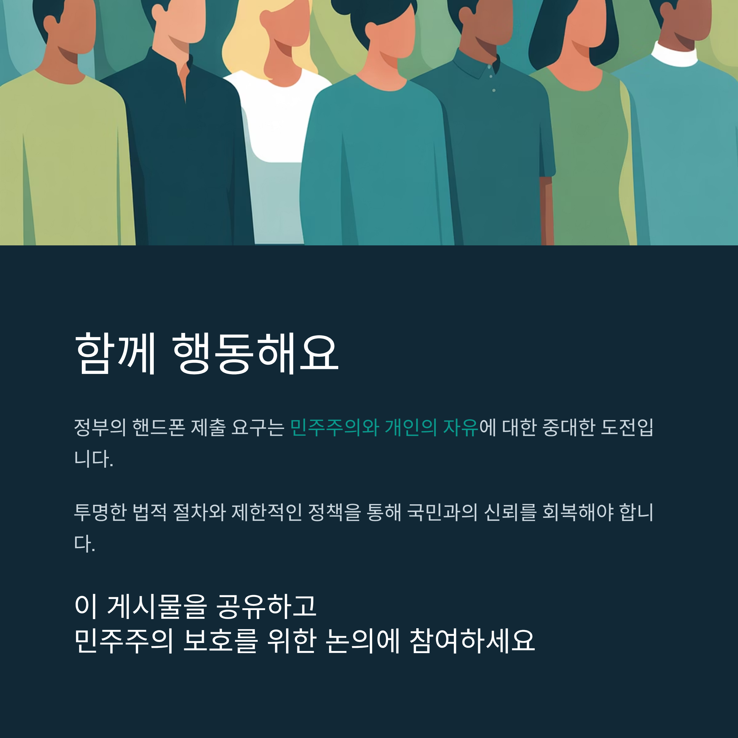 정부가 공무원의 핸드폰 제출을 강제하는 것은 개인의 디지털 권리와 사생활을 심각하게 위협하는 조치입니다. 핸드폰에는 메시지, 위치 정보, 검색 기록, 금융 및 건강 정보 등 민감한 데이터가 담겨 있습니다. 이를 제출하도록 강요하는 것은 개인의 생활을 감시하거나 통제할 가능성을 열어줍니다. 게다가 이런 수집이 효과적으로 관리되지 않거나 유출된다면 국민의 신뢰는 더욱 훼손될 것입니다.
