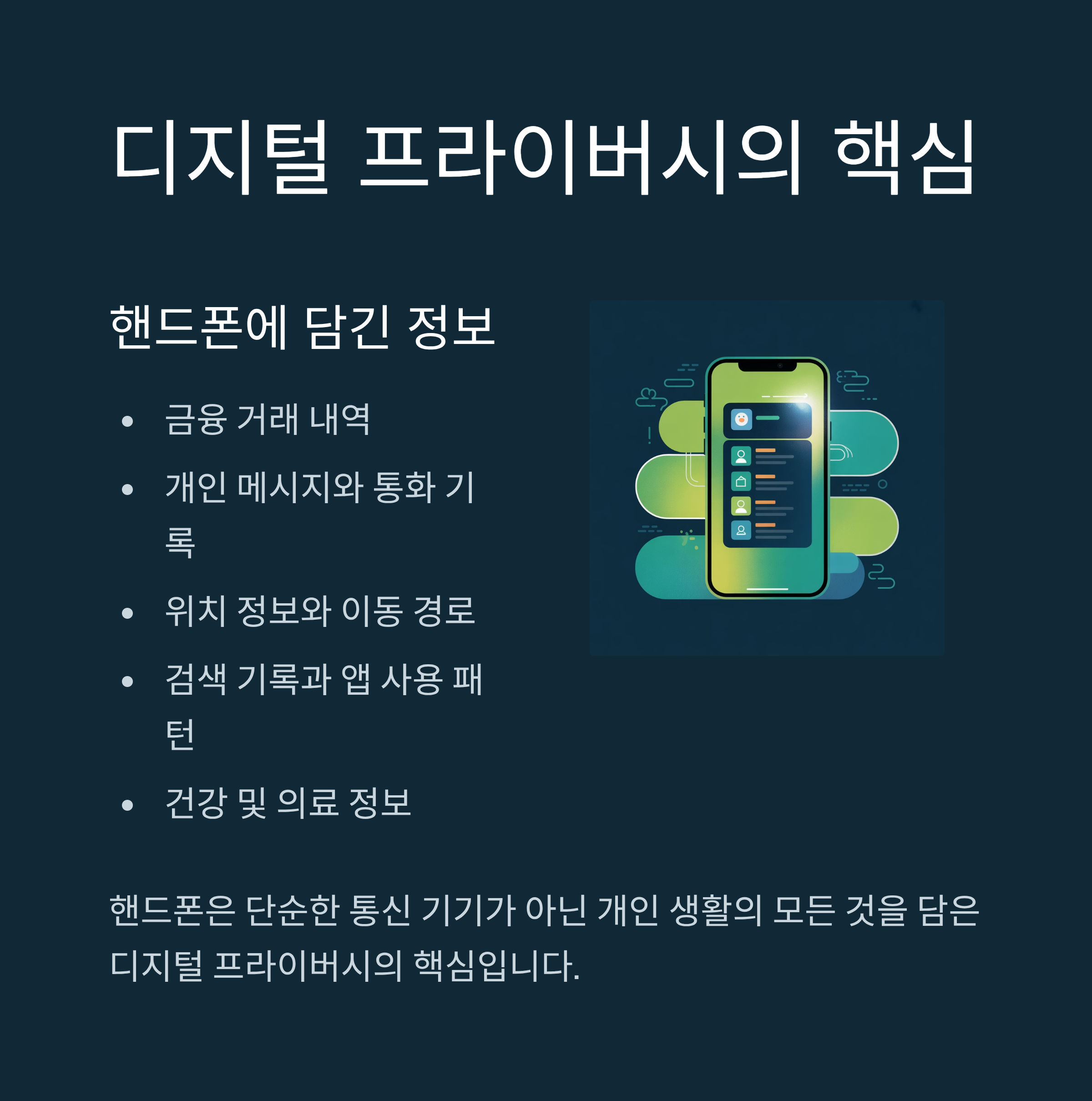 - 핸드폰은 금융 정보, 민감한 메시지 등 사생활의 핵심 자료를 포함하고 있어 논란 중심에 서 있음.