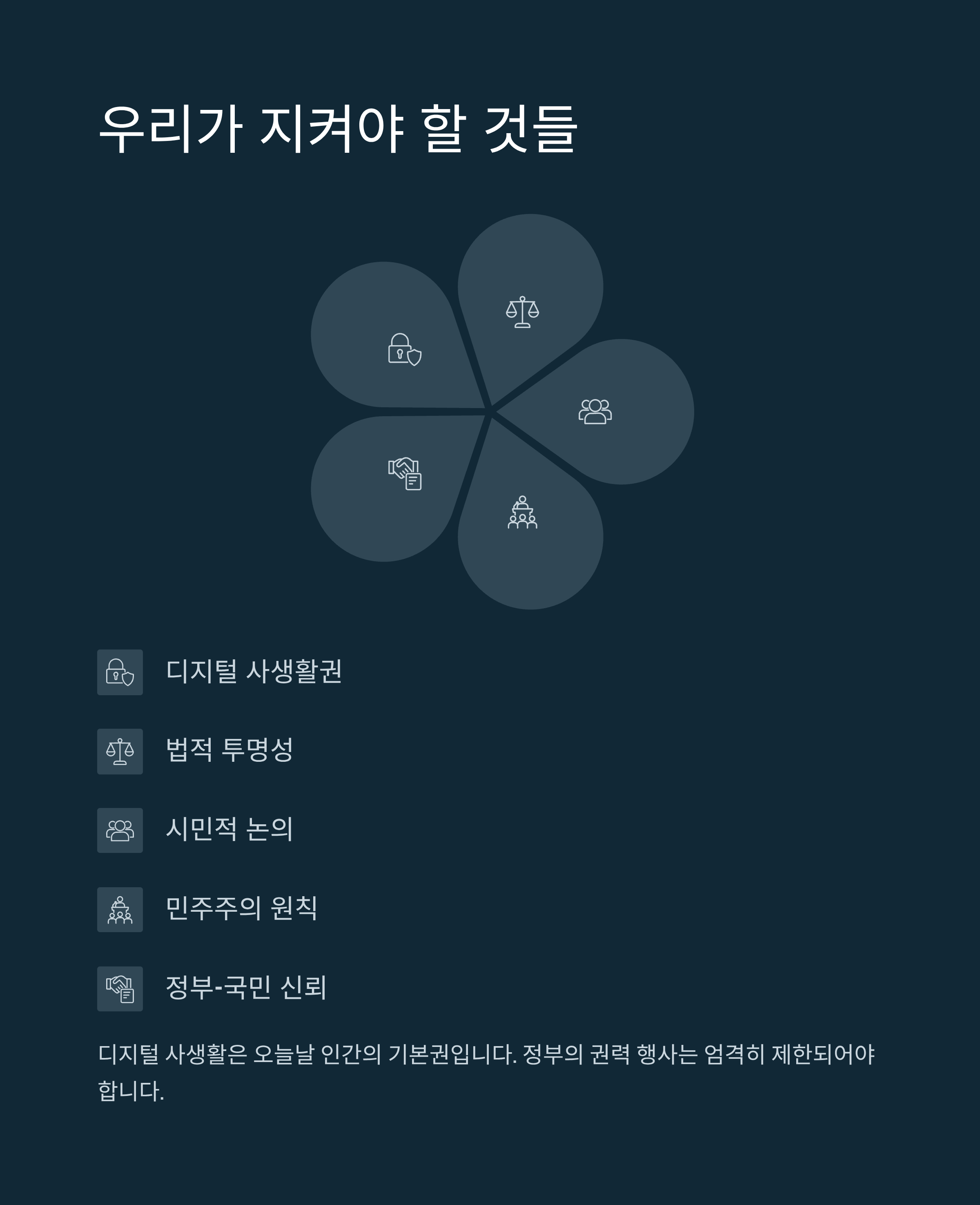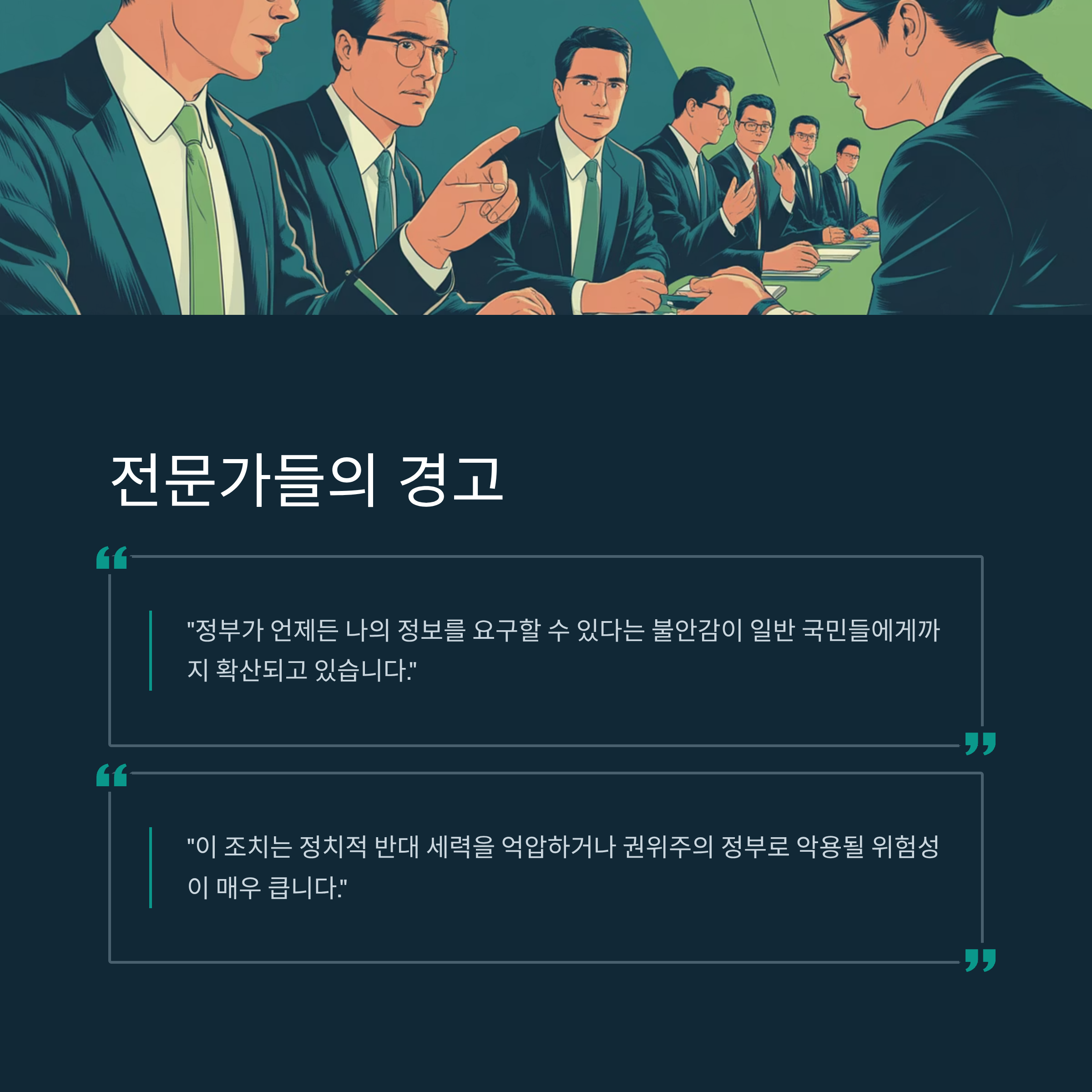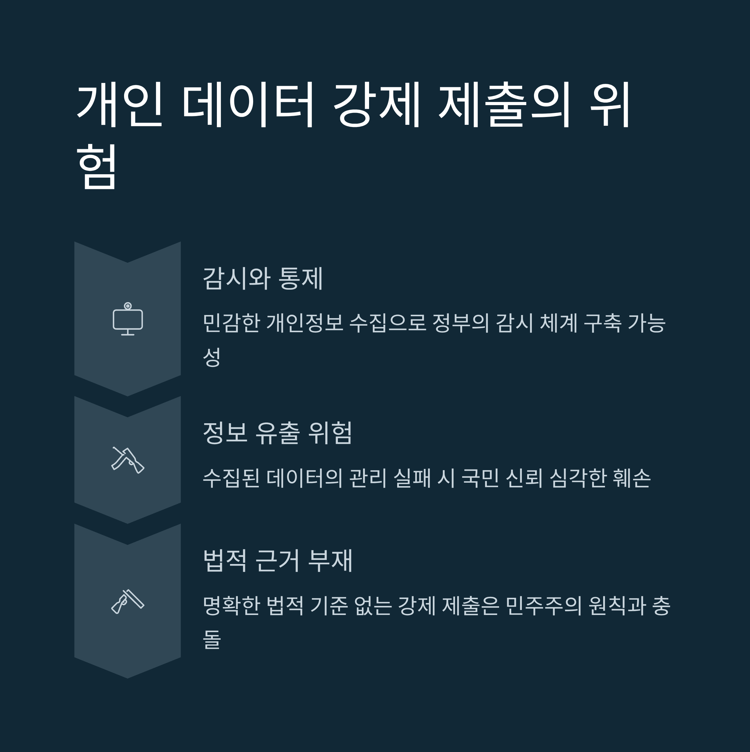또한 법적 근거와 엄격한 기준 없이 강제로 이뤄지는 데이터 제출은 민주주의적 원칙과 충돌합니다. 이는 공무원뿐 아니라 일반 국민들에게도 "정부가 언제든 나의 정보를 요구할 수 있다"는 불안감을 조성할 수 있습니다.