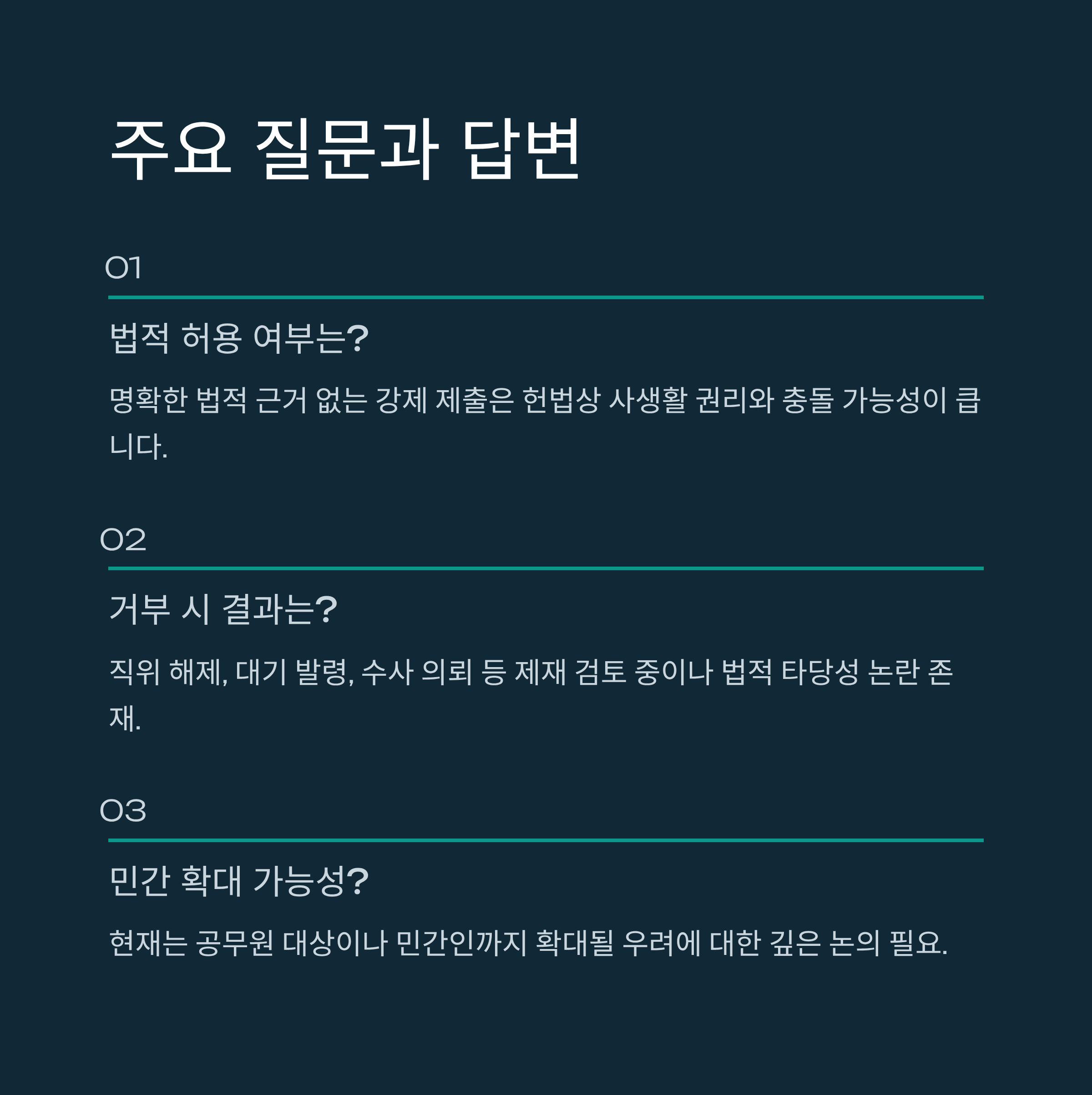 - 제출 거부 시 직위 해제, 대기 발령, 심지어 수사 의뢰 가능성이 제기됨.