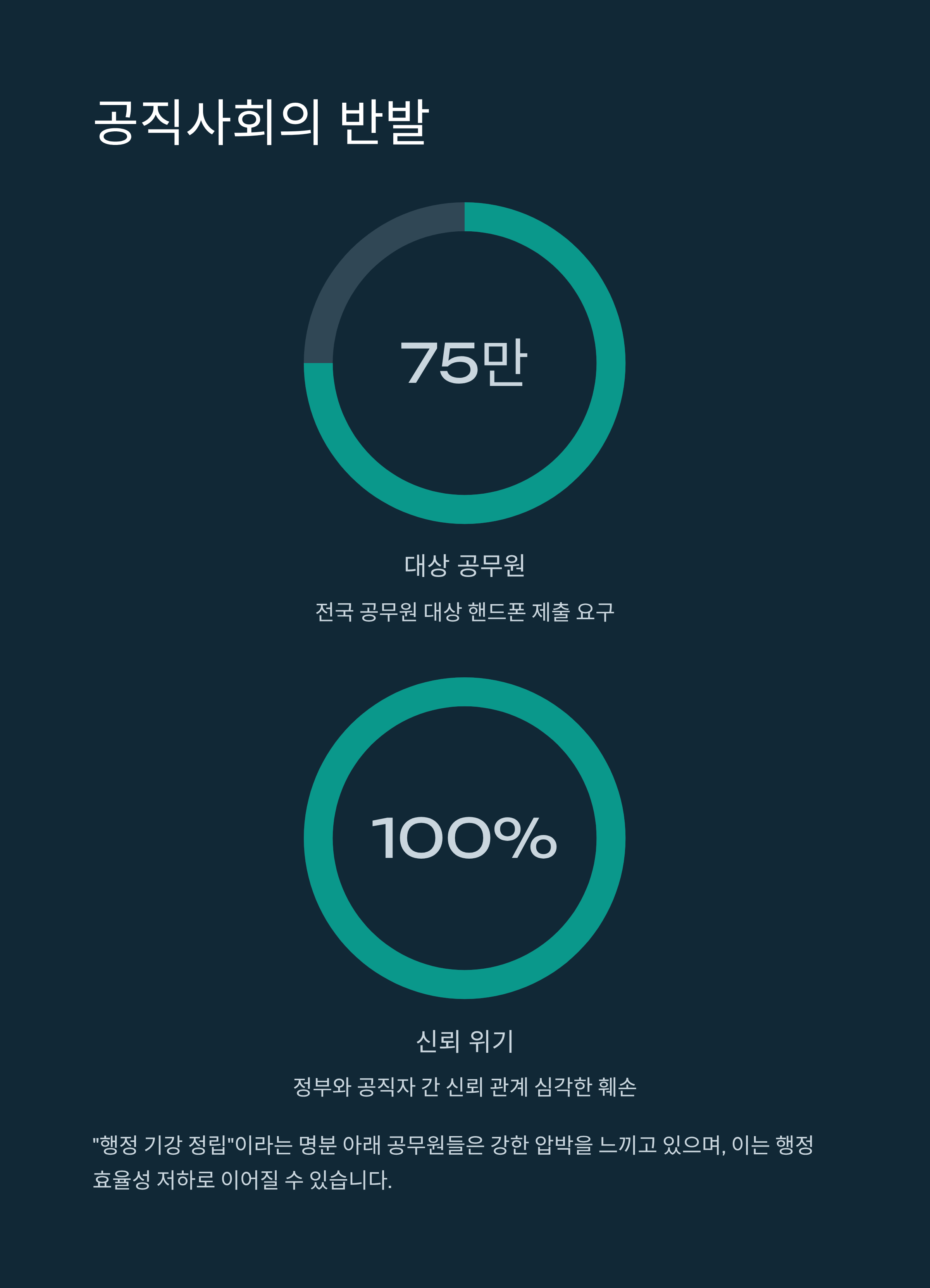 공무원 사회는 이미 정부의 요구에 대해 강한 반발을 표하고 있습니다. 이는 단지 개인적인 사생활 침해에 머무르지 않고, 정부와 공직자 간의 신뢰 문제로 확산되고 있습니다. 정부의 조치는 공무원들에게 "행정 기강 정립"이라는 명분 아래 압박으로 작용하고 있다는 인식이 퍼져 있습니다. 이 조치로 인해 공직사회 내부에서는 불만과 반감이 증가하고 있으며, 이는 궁극적으로 행정 효율성에 악영향을 끼칠 가능성이 큽니다.