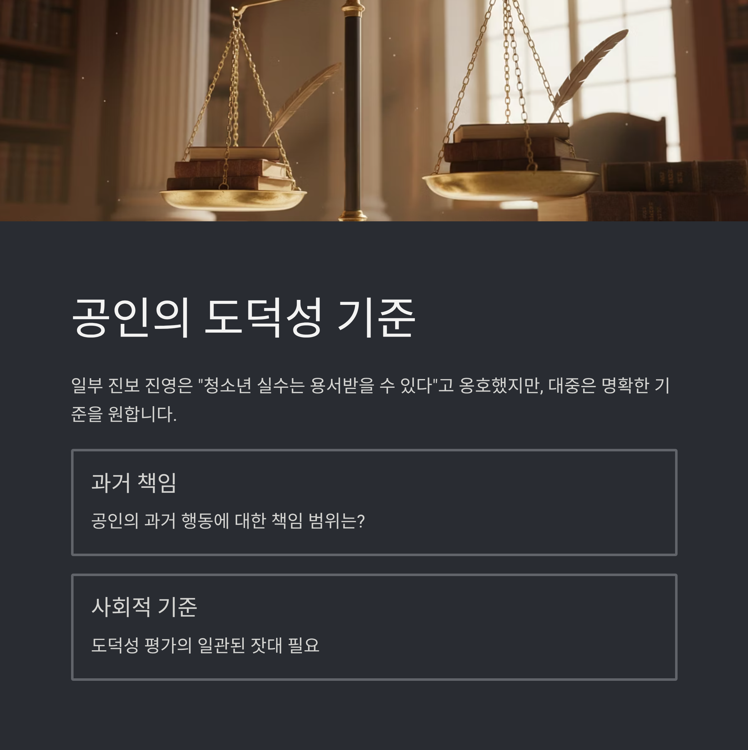 | A. 조진웅의 청소년 시절 행보와 현재의 정치적·사회적 이미지 간의 모순이 대중들로 하여금 공인의 과거 책임 범위와 사회적 기준 수립에 대한 논의를 촉발시켰습니다. |