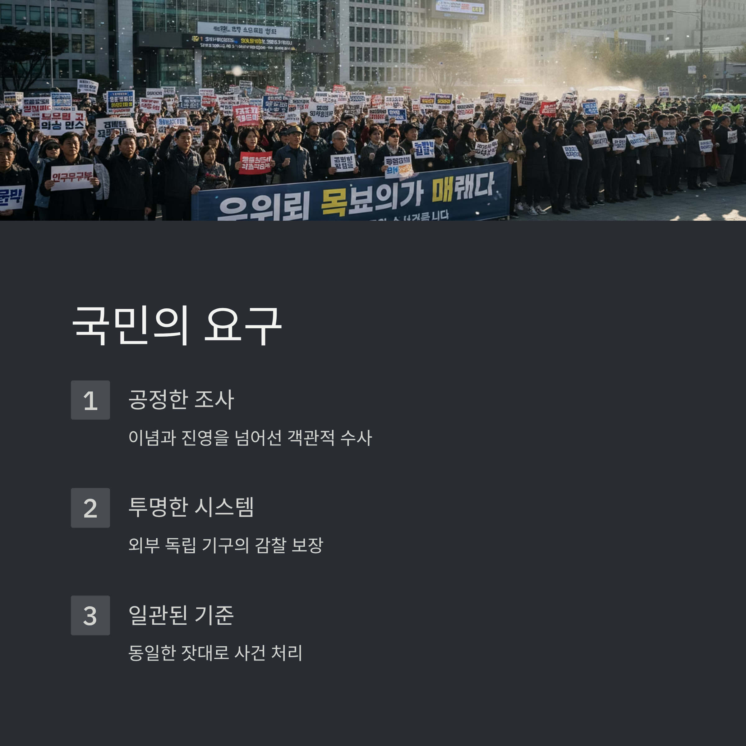 5. 향후 방향성: 정치권에서 객관적 감사를 통한 신뢰 회복과 새로운 사회적 기준 마련 필요.