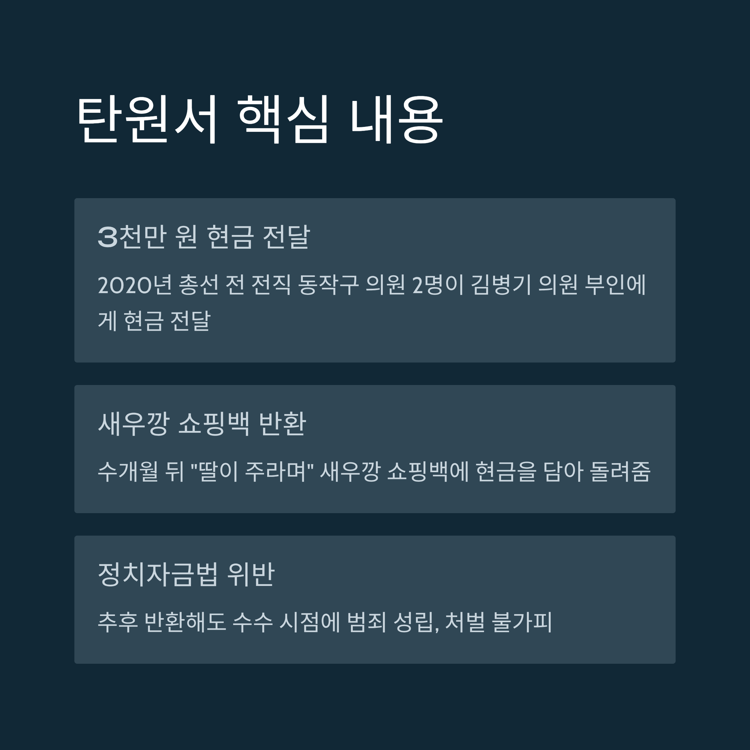 | A. 전직 동작구 의원 2명이 2020년 총선 전, 공천 등을 기대하고 김병기 의원의 부인에게 각각 2,000만 원과 1,000만 원의 불법 정치자금을 건넸다고 주장하는 것이 핵심입니다. 이들은 수개월 뒤 돈을 돌려받았으며, 그 과정이 담긴 구체적인 탄원서가 언론을 통해 공개되었습니다. |