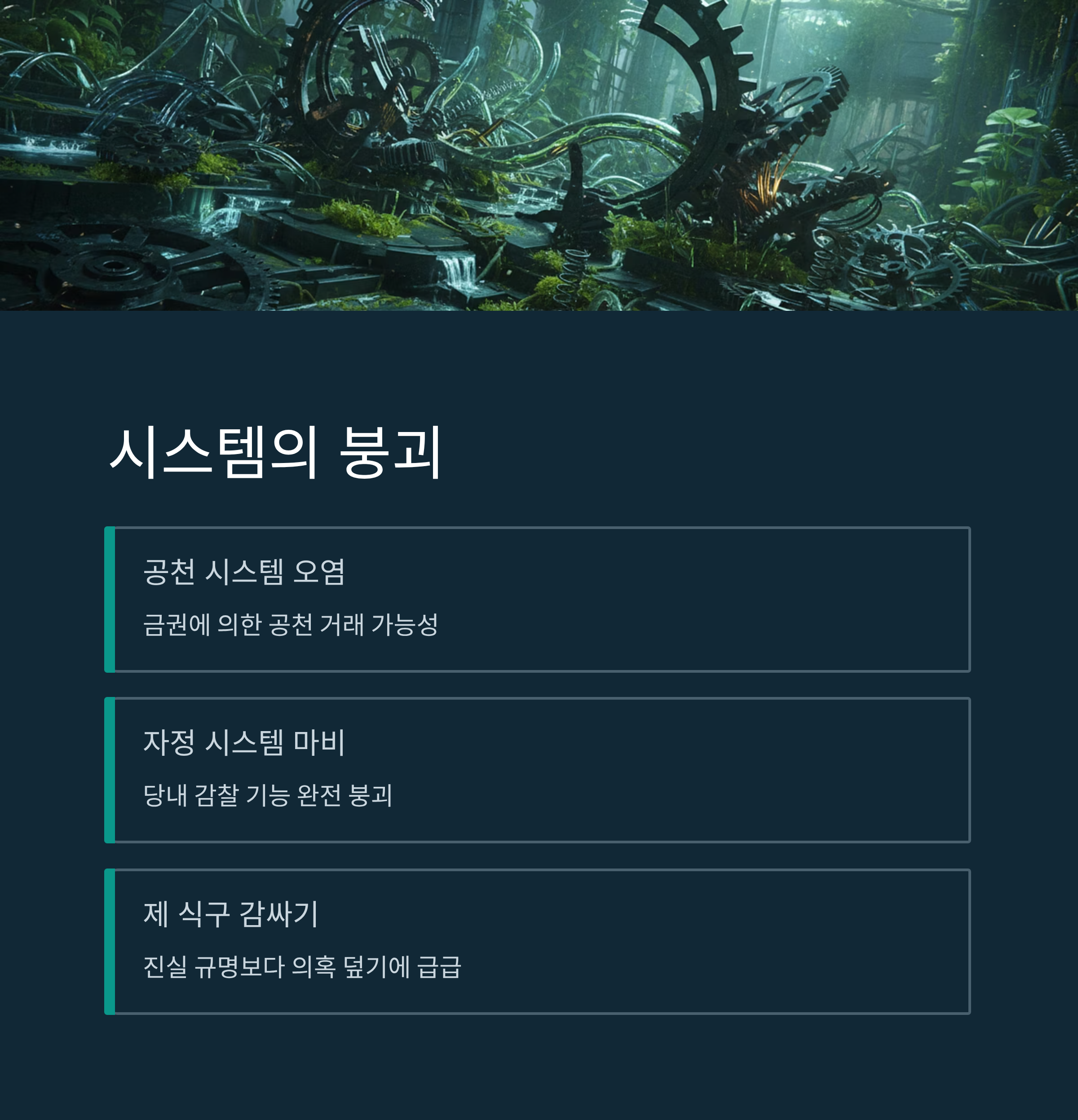 시스템 붕괴: 이번 사안은 당내 자정 시스템의 붕괴와 '제 식구 감싸기' 논란으로 번지며 단순 개인 비리를 넘어선 구조적 문제임을 시사합니다.