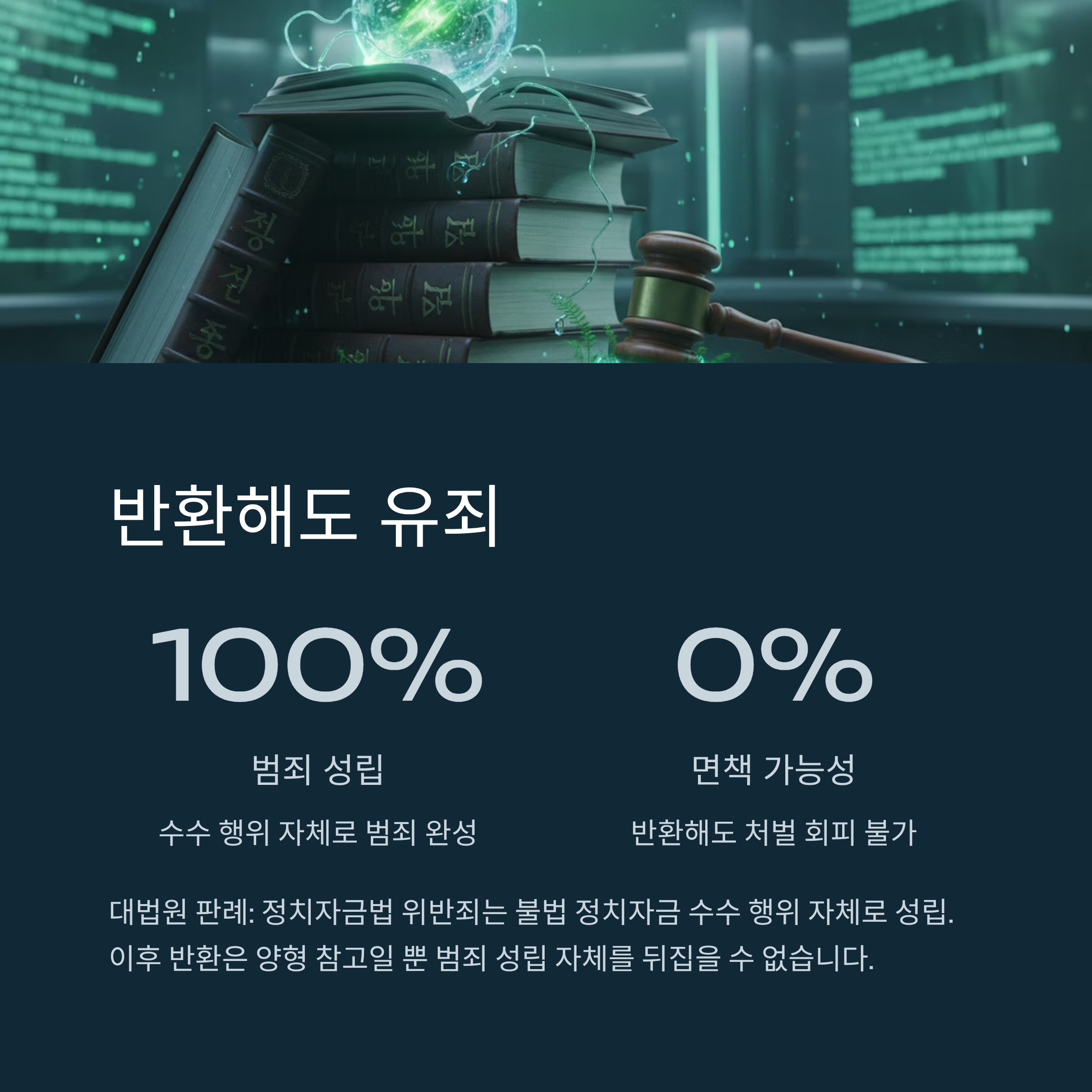 법적 책임: 불법 정치자금은 수수한 시점에 범죄가 성립하므로, 추후 반환했더라도 김병기 의원 측은 정치자금법 위반 처벌을 피하기 어렵습니다.