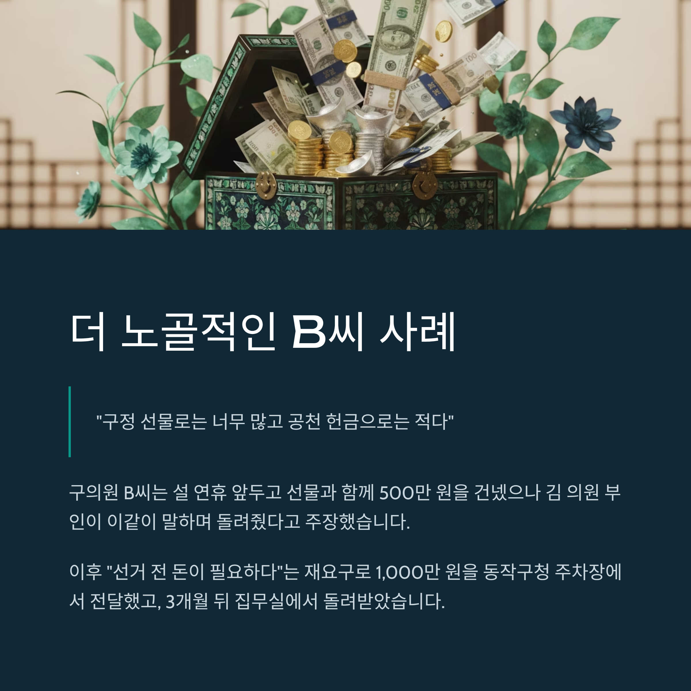 또 다른 구의원 B씨의 사례는 더욱 노골적입니다. B씨는 설 연휴를 앞두고 선물과 함께 500만 원을 건네자 김 의원 부인이 "구정 선물로는 너무 많고 공천 헌금으로는 적다"며 돌려줬다고 주장했습니다. 이후 김 의원 부인이 "선거 전에 돈이 필요하다"고 재차 요구해 1,000만 원을 준비했으나 이마저도 사양했다고 합니다. 하지만 며칠 뒤 김 의원의 최측근 구의원이 "사모님께 말했던 돈을 달라"고 요구해 결국 동작구청 주차장에서 1,000만 원을 전달했다는 것이 B씨의 주장입니다. 이 돈 역시 약 3개월 뒤 김 의원 집무실에서 돌려받았다고 밝혔습니다. 이는 공천을 대가로 한 금품 요구 정황을 구체적으로 보여주는 대목으로, 사실로 밝혀질 경우 파장은 걷잡을 수 없이 커질 것입니다.