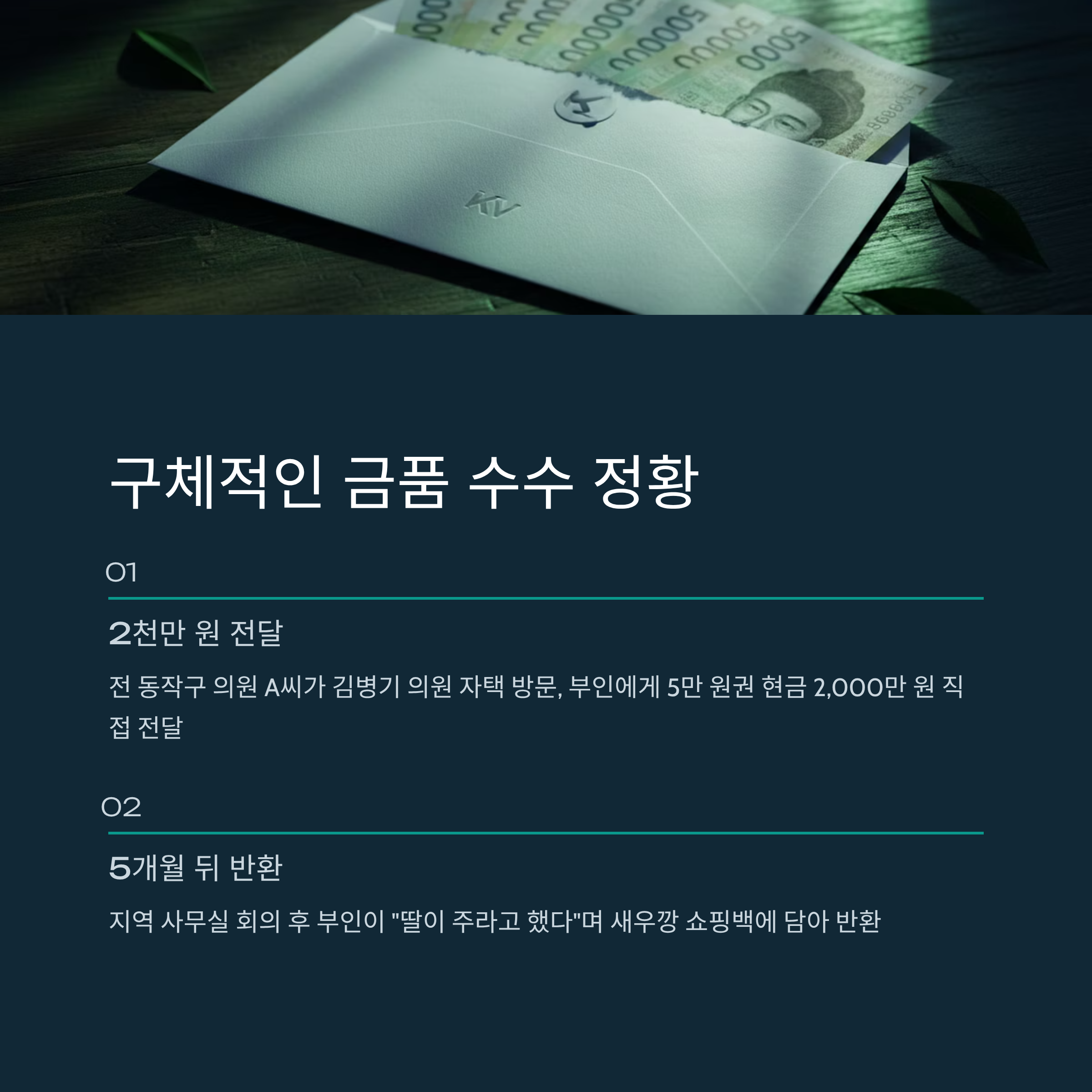 구체적인 금품 수수 정황: 2020년 총선 전, 전직 동작구 의원들이 김병기 의원 부인에게 총 3,000만 원의 현금을 전달했다는 상세한 주장이 제기되었습니다.