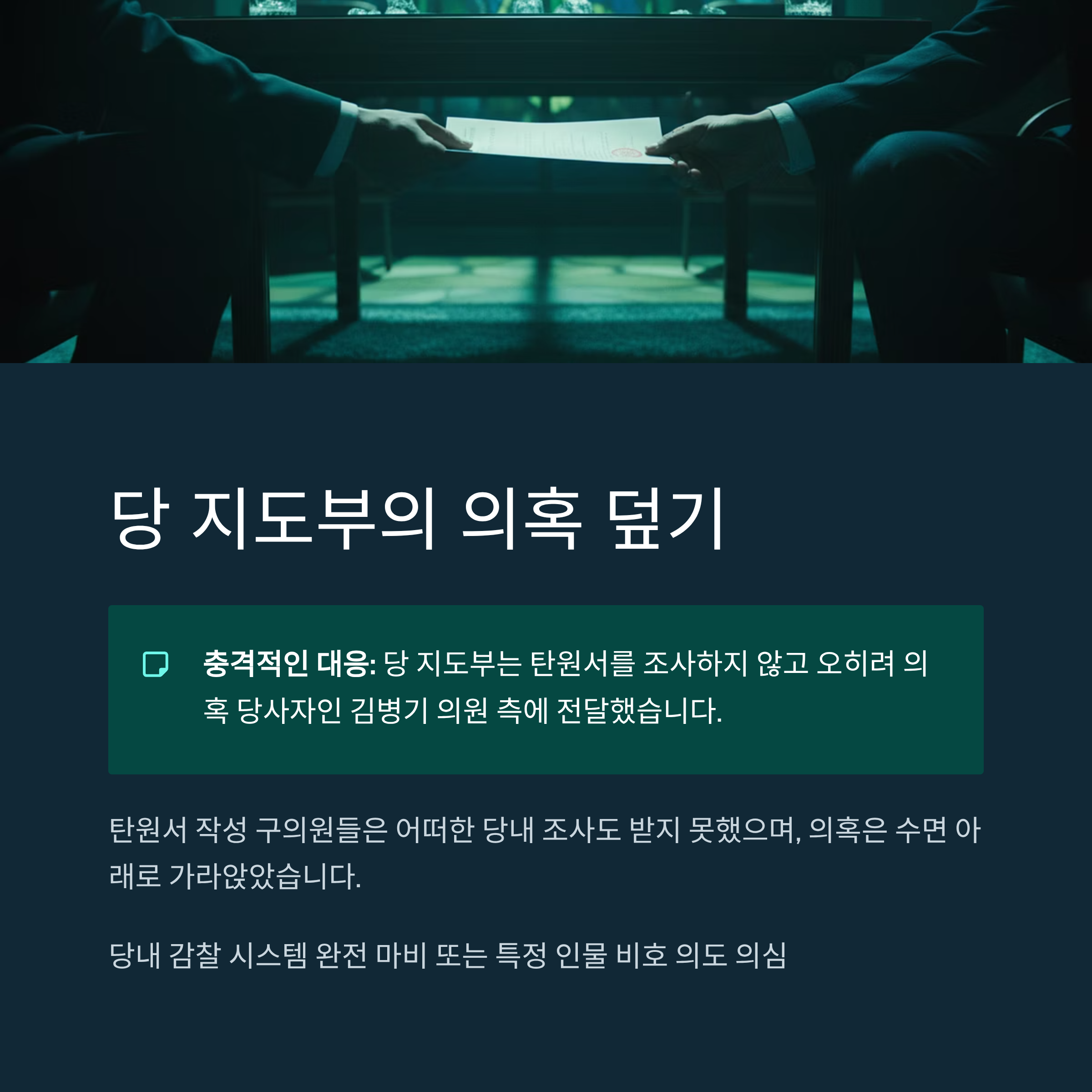 이 의혹이 더욱 심각한 문제로 비화하는 지점은 더불어민주당 지도부의 대응 방식에 있습니다. 당시 김병기 의원과 같은 지역구에서 경쟁했던 이수진 전 의원은 두 구의원으로부터 직접 탄원서를 받아 이를 묵과할 수 없다고 판단했습니다. 그는 "이런 사람이 공천 자격 심사위원장을 할 수 없다"는 취지로 이재명 당 대표에게 직접 탄원서를 전달하며 당 차원의 조사를 촉구했습니다. 당 대표에게 직접 전달된 비위 의혹은 통상적으로 윤리감찰단 등을 통해 철저한 조사가 이루어지는 것이 상식적인 절차입니다.