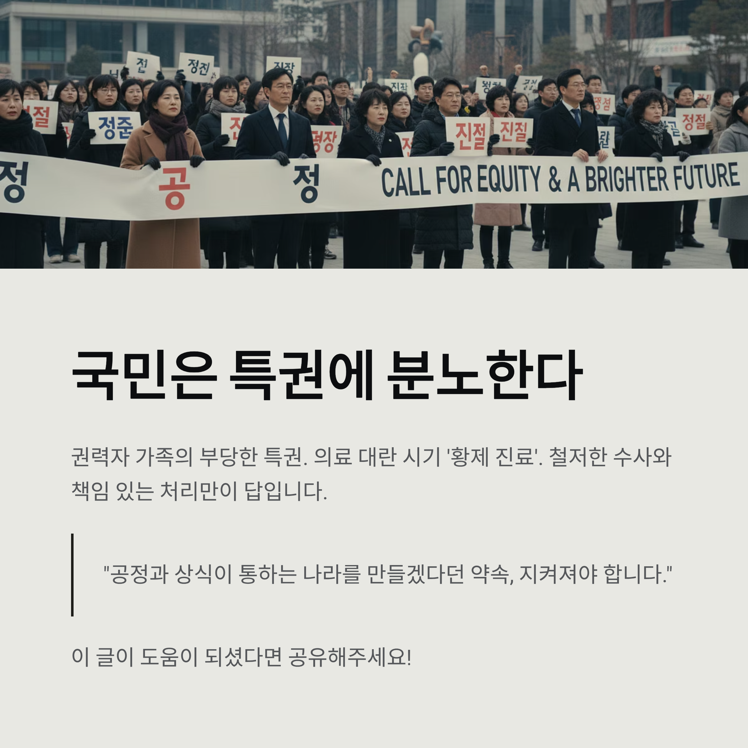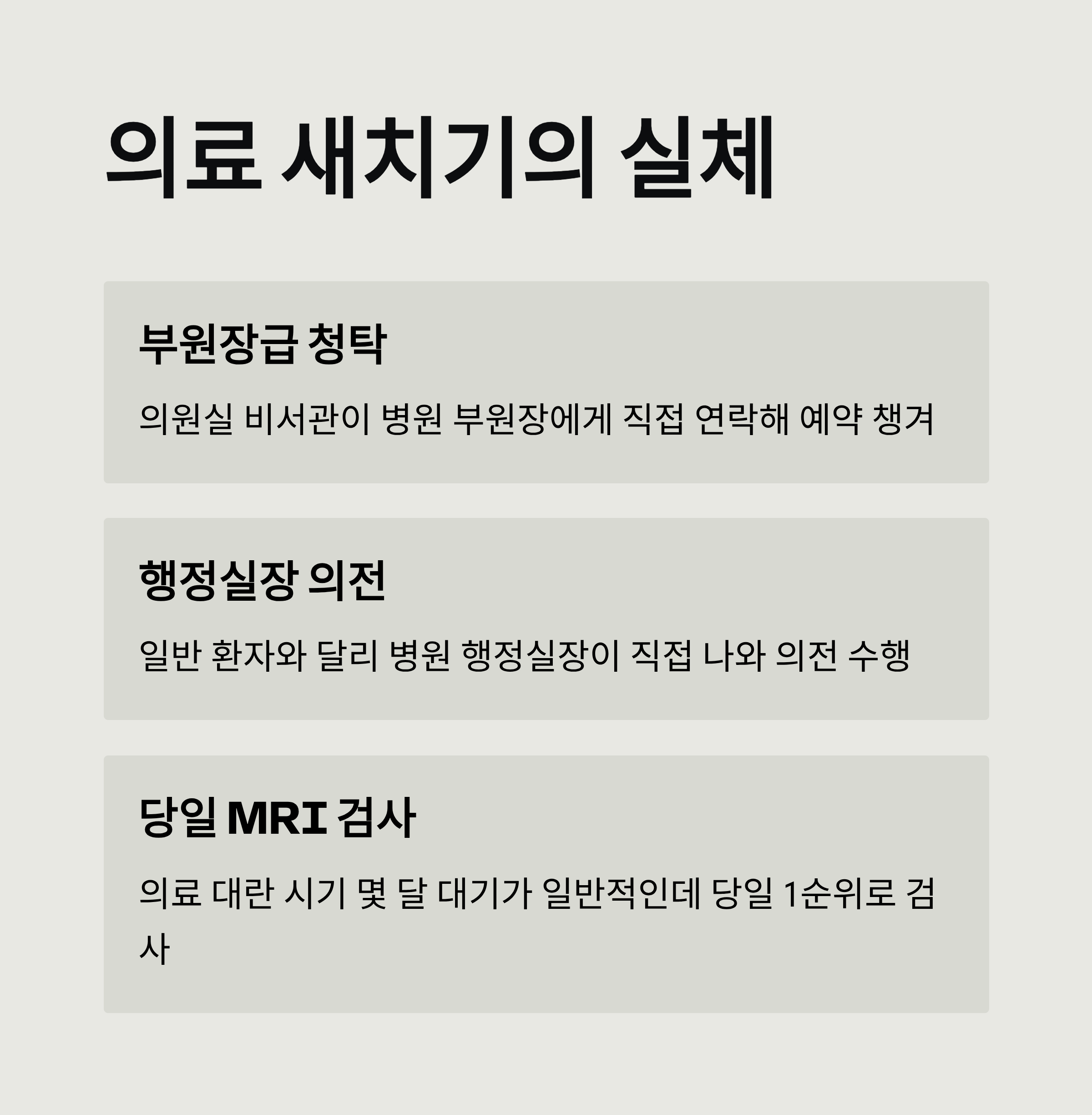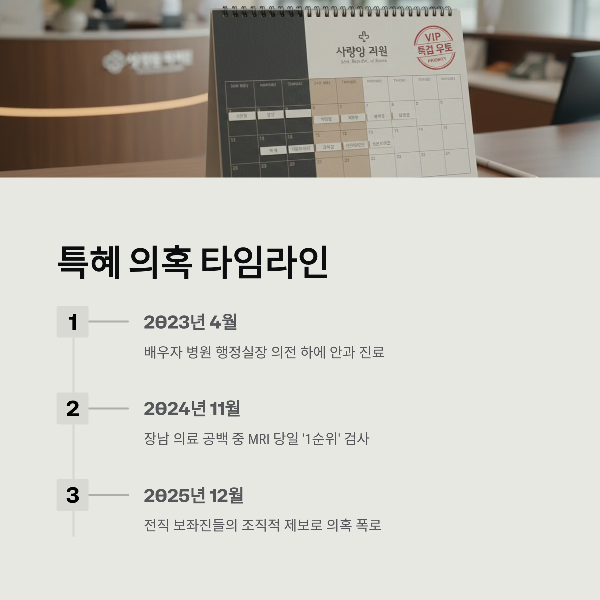 | 작년 11월 | 장남 | 의료 공백 중 MRI 당일 '1순위' 검사 | 명백한 '의료 새치기' 특혜 논란 |
