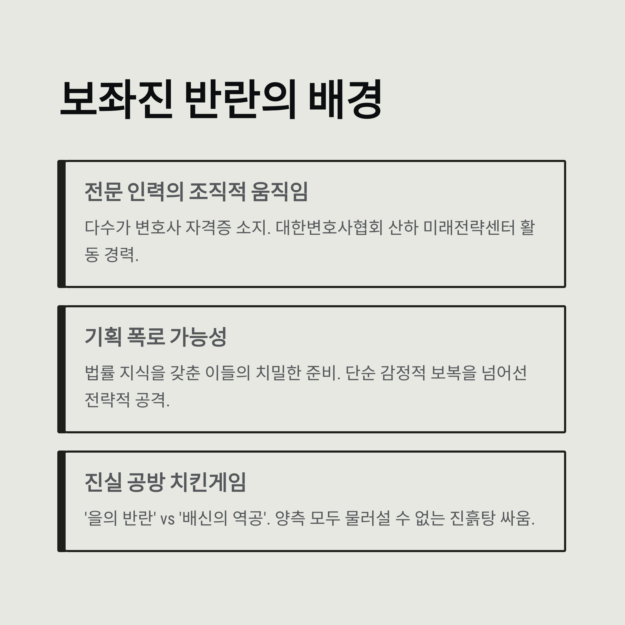 이번 사태의 특이점은 내부자들, 즉 전직 보좌진들이 공격의 선봉에 섰다는 것입니다. 김 원내대표는 이들이 참여한 비밀 대화방 '여의도 맷돌'의 내용을 공개하며, 이들이 윤석열 전 대통령의 12.3 계엄 사태를 희화화하고 자신과 가족을 성적으로 모욕했다고 주장했습니다. 그러나 폭로에 나선 보좌진 다수가 변호사 자격증을 소지한 전문 인력이며, 이들이 최근까지 대한변호사협회 산하 '미래전략센터'에서 활동했다는 점은 주목할 만합니다. 단순한 감정적 보복을 넘어, 법률적 지식을 갖춘 이들이 치밀하게 준비한 '기획 폭로'의 가능성이 제기됩니다. 김 원내대표 측은 이를 '배신'으로 규정하고 역공을 취하고 있지만, 보좌진들이 '갑질'을 견디다 못해 터뜨린 것이라는 반론도 만만치 않아 진실 공방은 치킨게임 양상으로 치닫고 있습니다.
