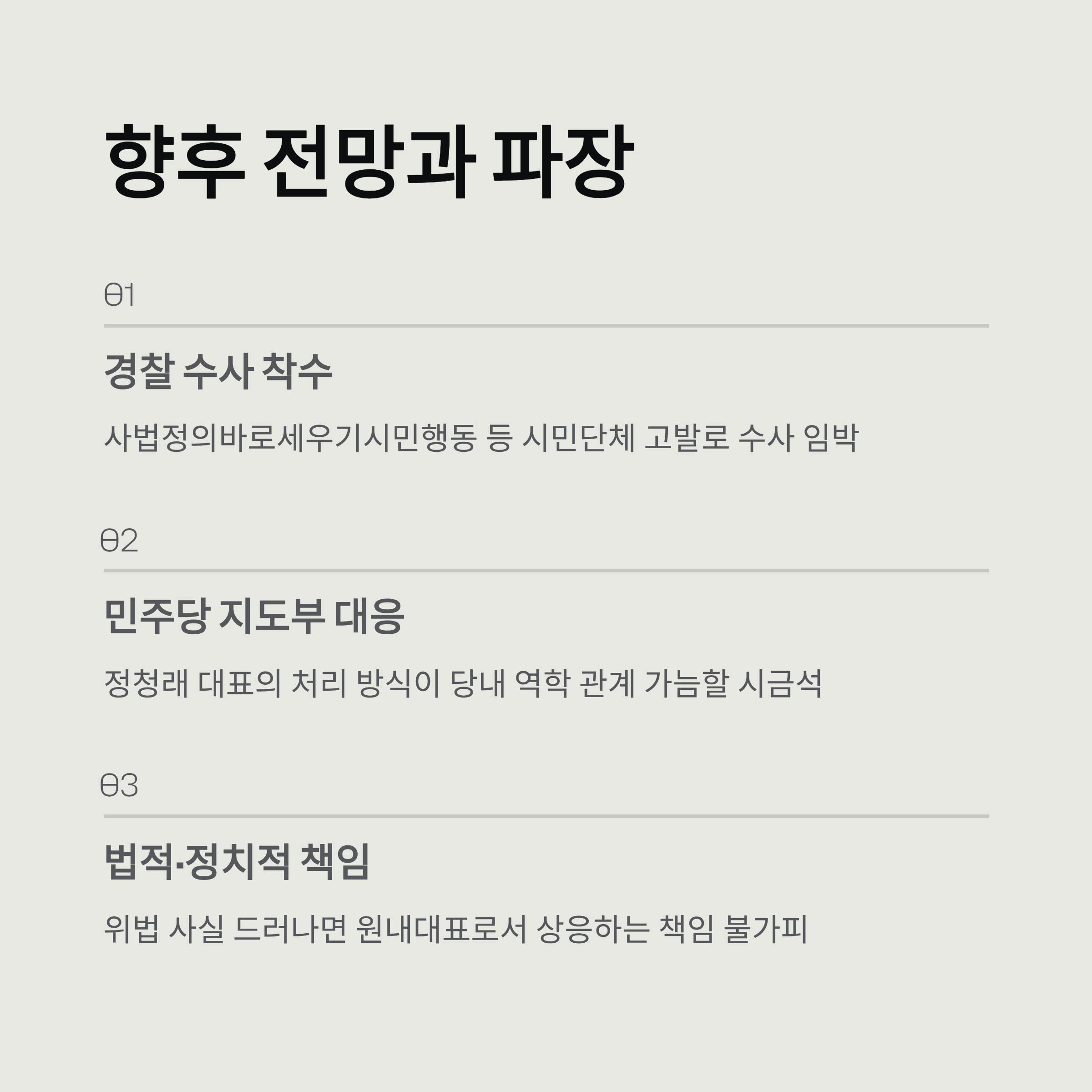 정치권에서는 이번 사태를 이재명 대통령 집권 2년 차, 내년 지방선거를 앞두고 벌어지는 여권 내 권력 투쟁으로 해석하고 있습니다. 김병기 원내대표는 대표적인 친명(친이재명)계 핵심 인사입니다. 반면, 현재 당을 이끌고 있는 정청래 대표와의 관계에서 미묘한 긴장감이 감지되고 있습니다. 일각에서는 정청래 대표 측이 차기 지방선거 공천권과 당내 주도권을 확고히 하기 위해 경쟁자인 김 원내대표를 견제하는 과정에서 이러한 폭로가 묵인되거나 혹은 기획된 것이 아니냐는 '정청래 배후설'까지 제기하고 있습니다. 김 원내대표가 무너지면 그 권력의 공백을 누가 메우느냐가 핵심인데, 이는 현재 당권을 쥔 세력에게 유리하게 작용할 수 있기 때문입니다. 사법정의바로세우기시민행동(사세행) 등 시민단체의 고발까지 이어지며 김 원내대표는 정치적 치명상을 입게 되었습니다.