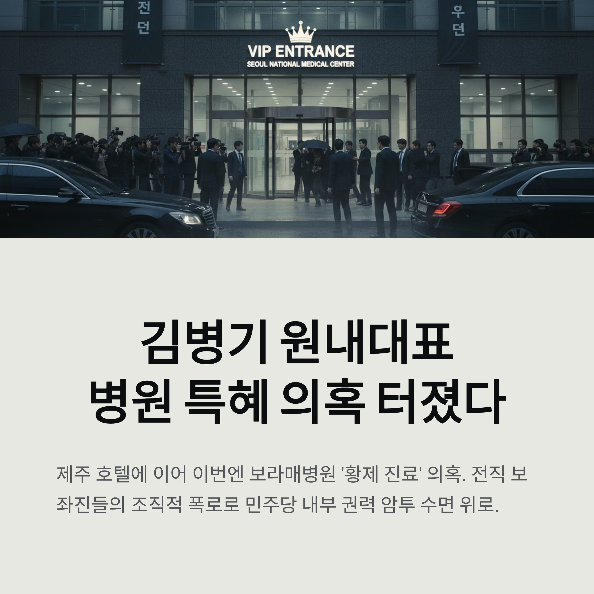 2025년 12월, 집권 여당인 더불어민주당의 김병기 원내대표를 둘러싼 비리 의혹이 파상적으로 터져 나오며 정국이 술렁이고 있습니다. 제주 KAL 호텔 숙박 특혜, 자녀의 숭실대 편입학 및 국정원 채용 의혹에 이어, 이번에는 서울 보라매병원에서의 가족 '황제 진료' 의혹까지 제기되었습니다. 이는 단순한 개인의 비리 의혹을 넘어, 이재명 대통령 집권 이후 당내 주도권을 둘러싼 권력 암투의 신호탄이라는 해석이 지배적입니다.