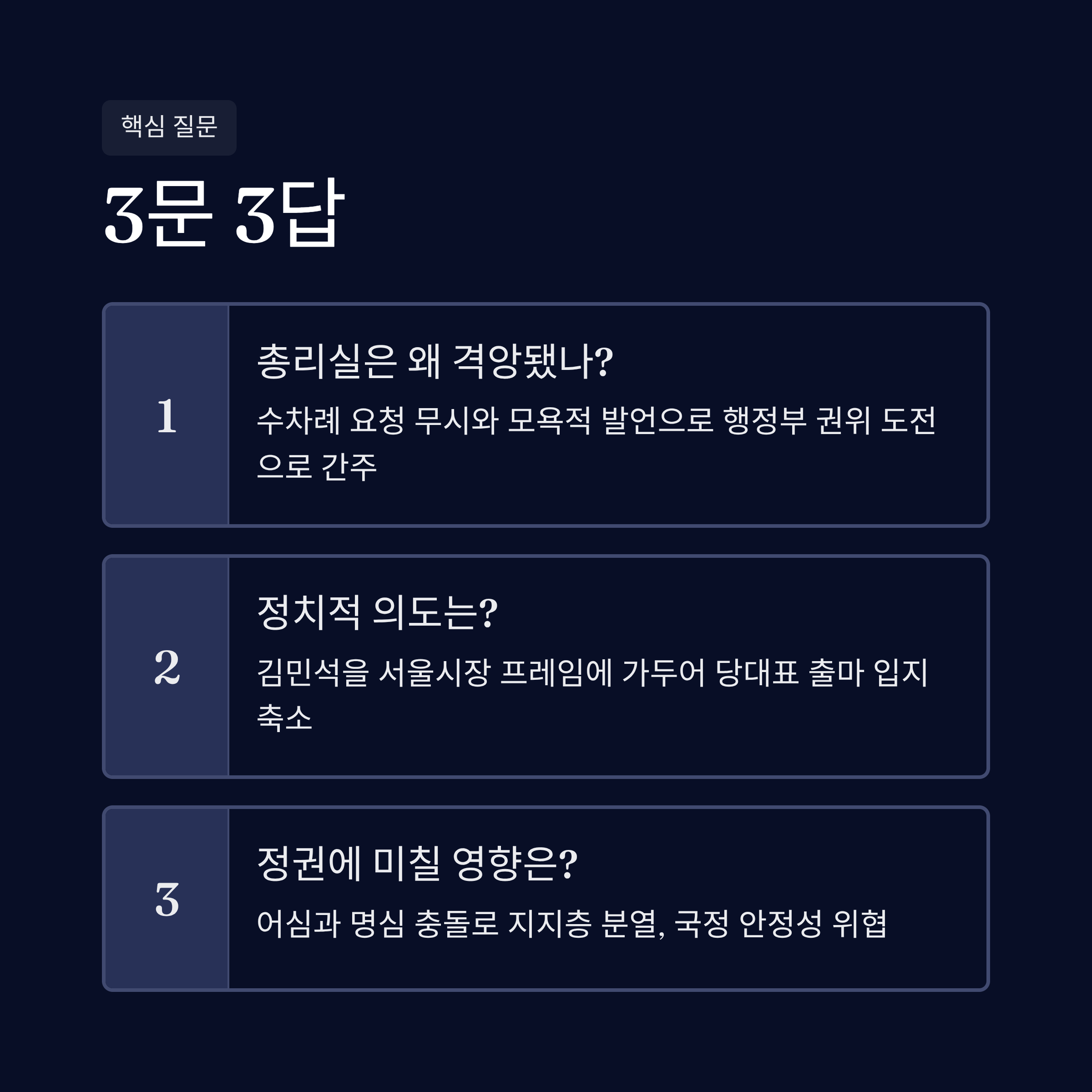 | 김민석 총리 측이 수차례 공문과 구두로 서울시장 여론조사 후보군 제외를 요청했음에도, 김어준이 이를 무시하고 조사를 강행했기 때문입니다. 또한 김어준이 방송에서 총리의 의사를 무시하는 듯한 모욕적인 발언을 이어가자, 이를 행정부 권위에 대한 심각한 도전으로 간주하고 강력하게 경고한 것입니다. |