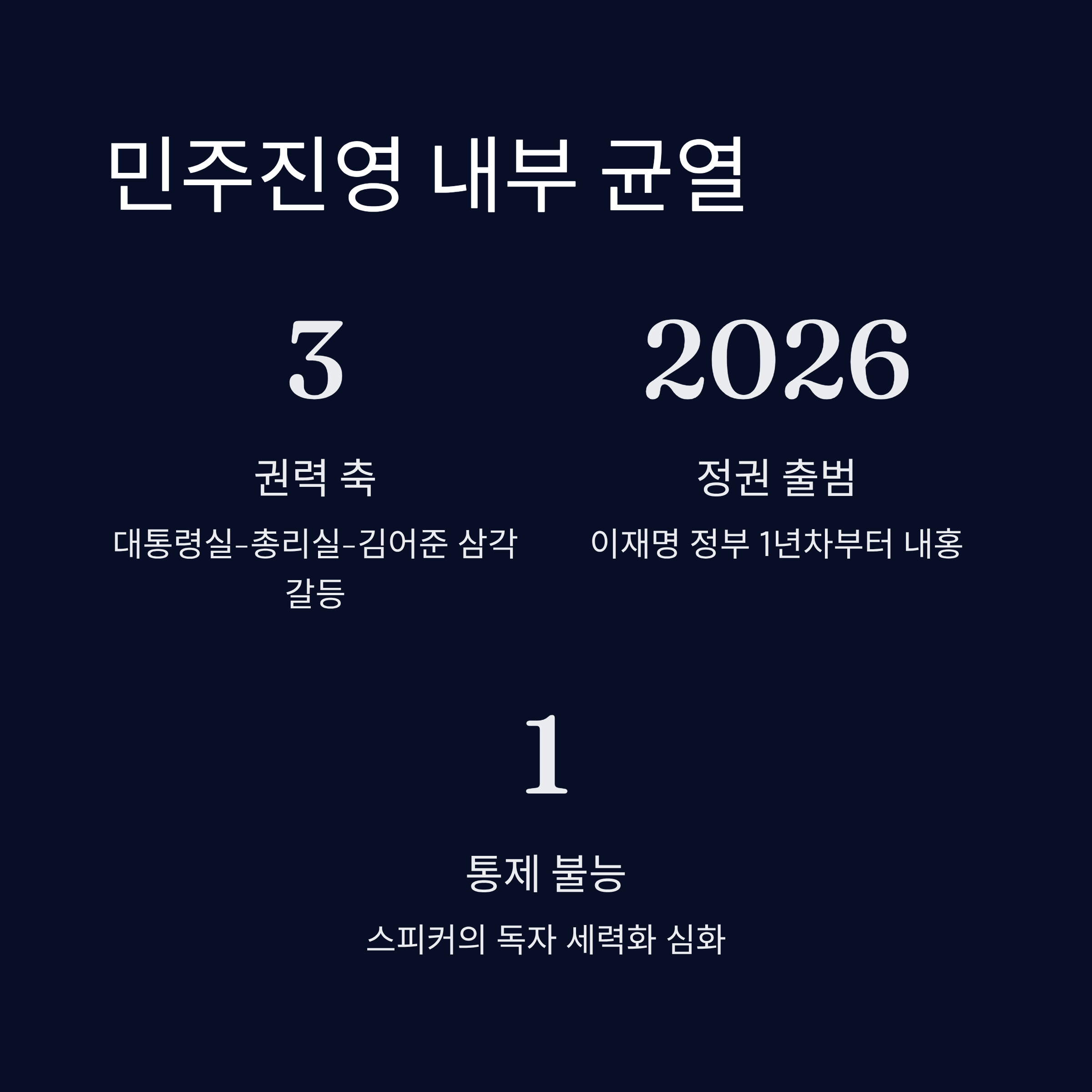 | 김어준이라는 강력한 스피커가 정부의 통제를 벗어나 독자적인 정치 세력화되고 있음을 보여줍니다. 이는 '어심(김어준)'과 '명심(이재명)'의 충돌을 야기해 지지층 분열을 초래할 수 있으며, 국정 운영의 혼란을 가중시켜 집권 중반기 정권의 안정성을 해칠 수 있는 심각한 리스크 요인이 됩니다. |