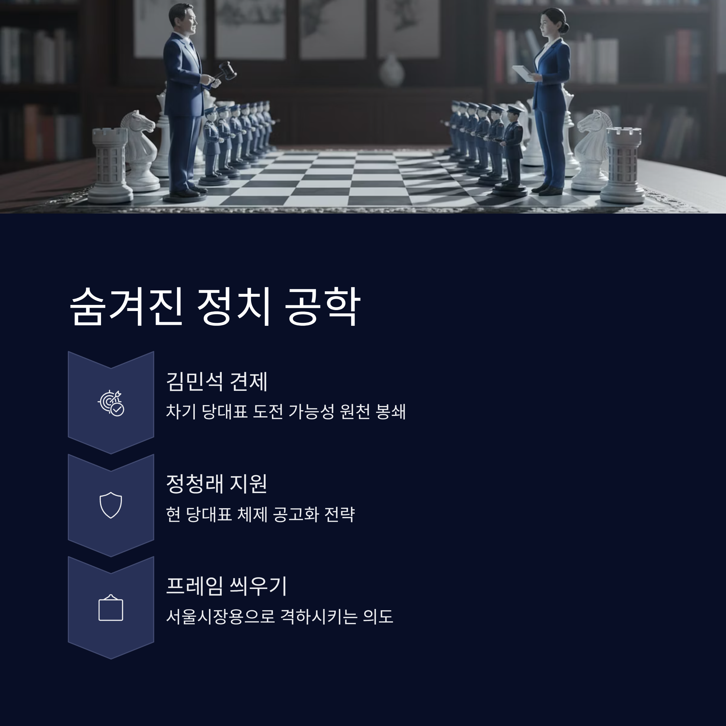 | 표면적으로는 여론조사지만, 실제로는 김민석 총리를 서울시장 후보 프레임에 가두어 차기 당대표 출마 등 중앙 정치에서의 입지를 축소시키려는 의도로 해석됩니다. 이는 현재 당권을 쥐고 있는 정청래 대표를 지원하고, 잠재적 경쟁자인 김민석을 견제하기 위한 '여론 권력'의 행사로 보입니다. |