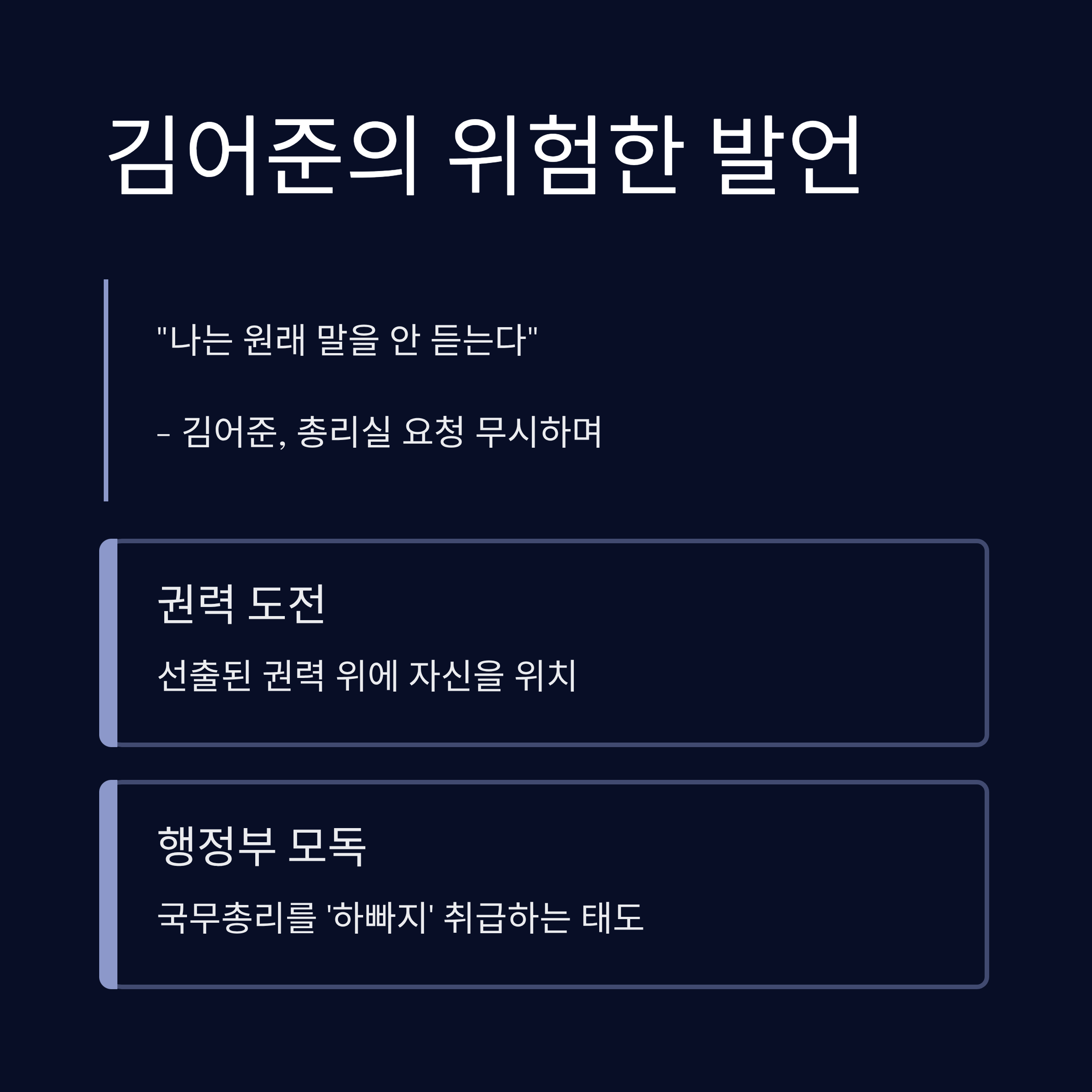 김어준과 총리실의 충돌은 단순한 감정 싸움이 아닙니다. 이는 선출되지 않은 여론 권력이 선출된 권력과 임명된 행정 권력을 능가하려는 하극상의 전조이자, 민주진영 내부 권력 투쟁의 신호탄입니다. 김어준은 스스로를 "말을 안 듣는 사람"으로 정의하며 성역 없는 영향력을 과시하고 있지만, 이는 국정 운영의 질서를 흔드는 위험천만한 도박입니다.