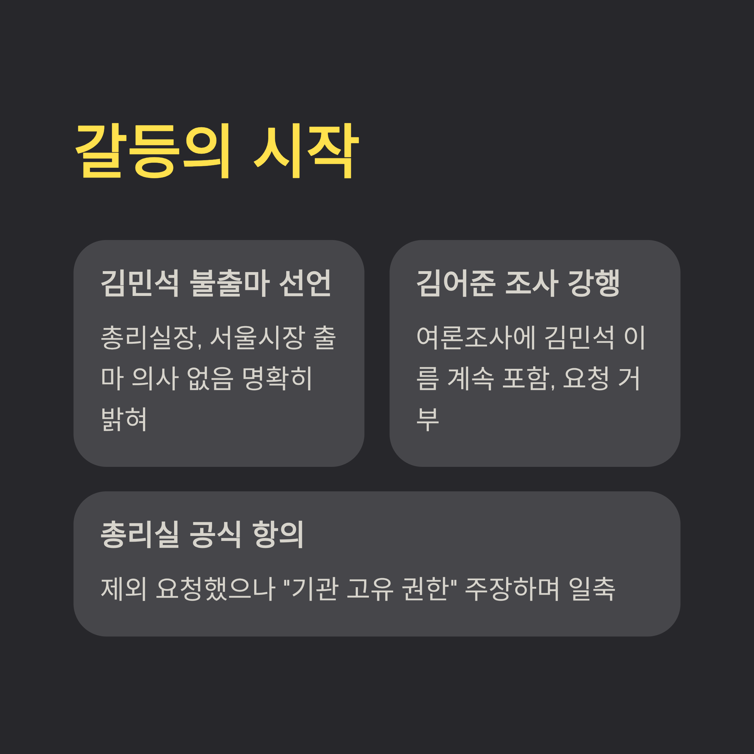총리실과 김민석 본인이 "출마 의사가 없으니 제외해달라"고 요청했음에도, 김어준 측은 "기관의 고유 권한"이라며 이를 거부했습니다.