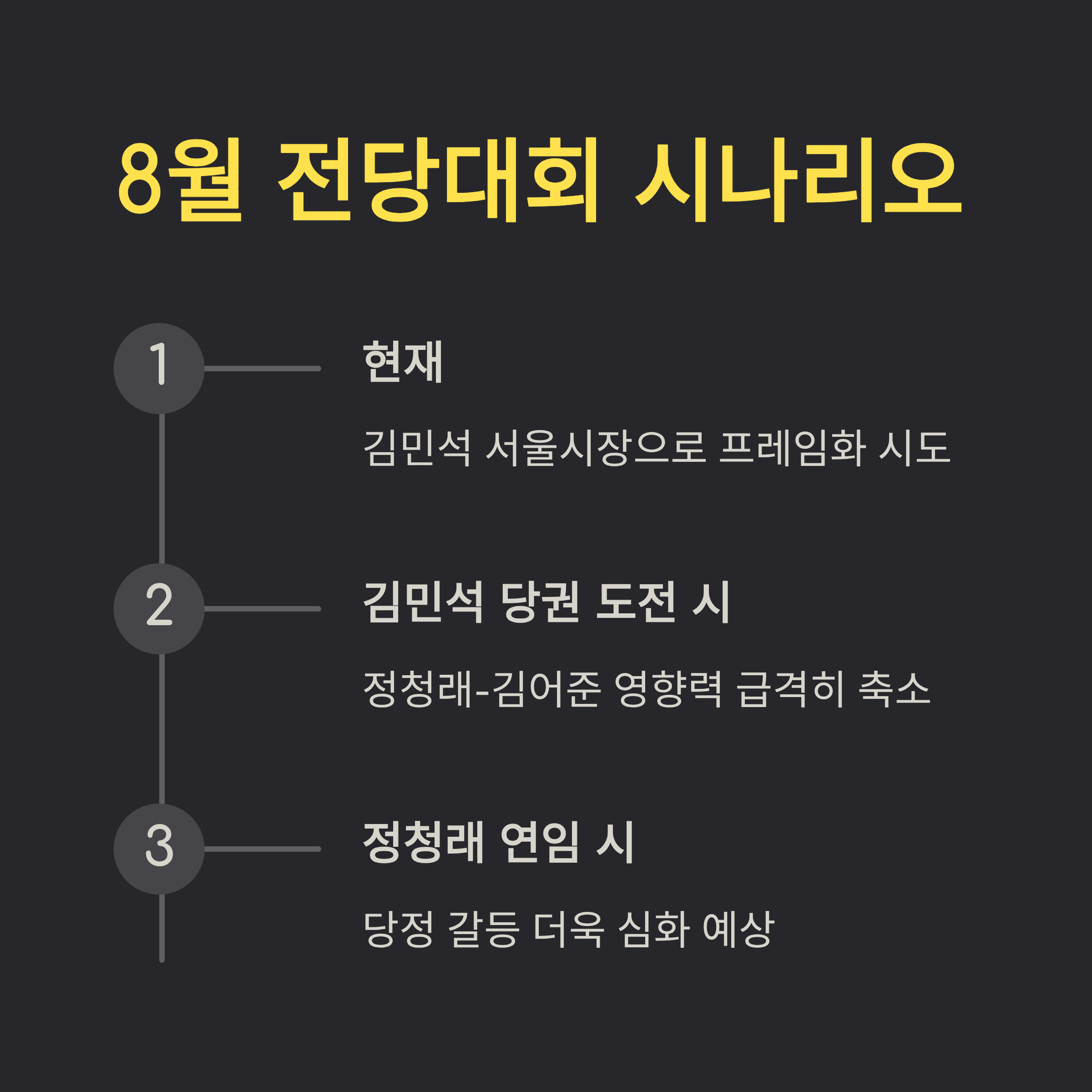 | A3. 이번 논란은 이재명 대통령 측(김민석 등 정부 인사)과 정청래 당 대표 측의 권력 투쟁이 본격화되었음을 시사합니다. 8월 전당대회에서 김민석이 출마해 당권을 잡을 경우 정청래와 김어준의 영향력은 급격히 축소될 것이며, 반대로 정청래가 연임하면 당정 갈등이 더욱 심화할 수 있습니다. |