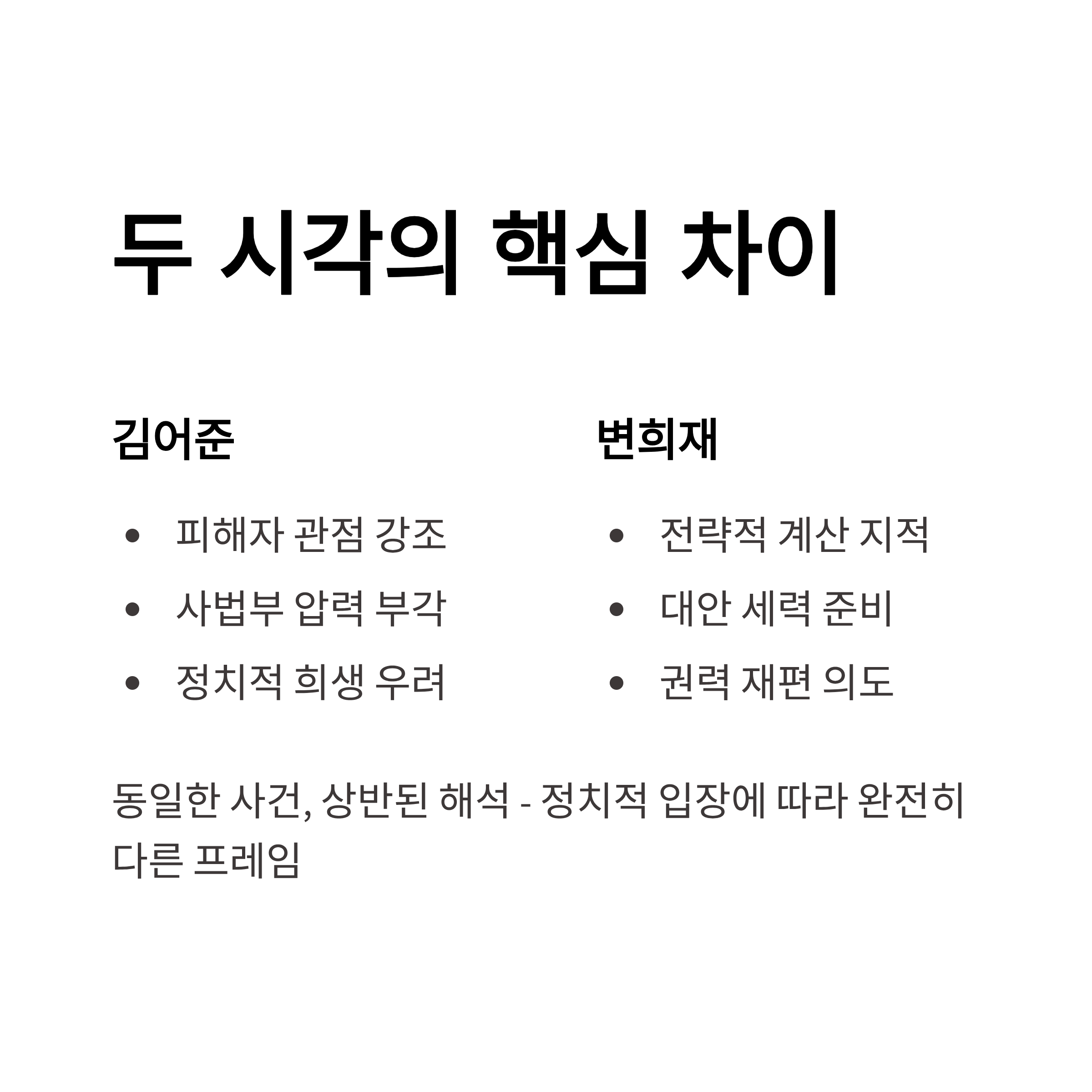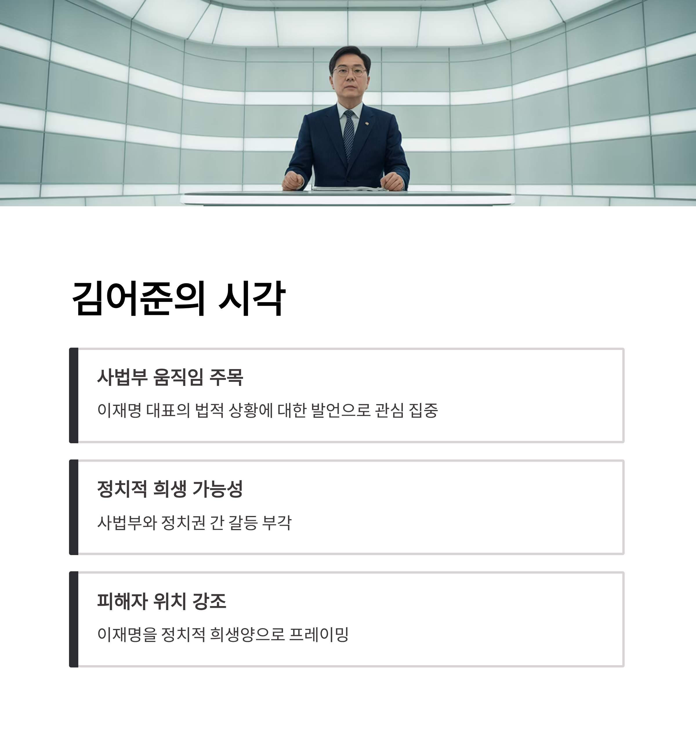 김어준은 방송에서 사법부의 움직임과 이재명 대표의 법적 상황에 대해 발언하며 이에 대한 관심을 불러일으켰습니다. 김어준의 발언은 이재명이 정치적으로 희생될 수 있다는 가능성을 암시하며, 사법부와 정치권 간 갈등을 부각하고 있습니다. 반면 변희재는 김어준이 정치적 대안을 염두에 둔 전략적 주장을 하고 있다고 비판합니다. 그가 언급한 대안은 정청례로 이어지며, 이는 민주당 내부 권력 구도의 신호탄으로 해석됩니다. 두 명의 주장은 동일한 사건을 바라보는 시각이 다르며, 한쪽은 피해자의 위치를 강조하고, 다른 한쪽은 정치적 계산 속성을 부각합니다.