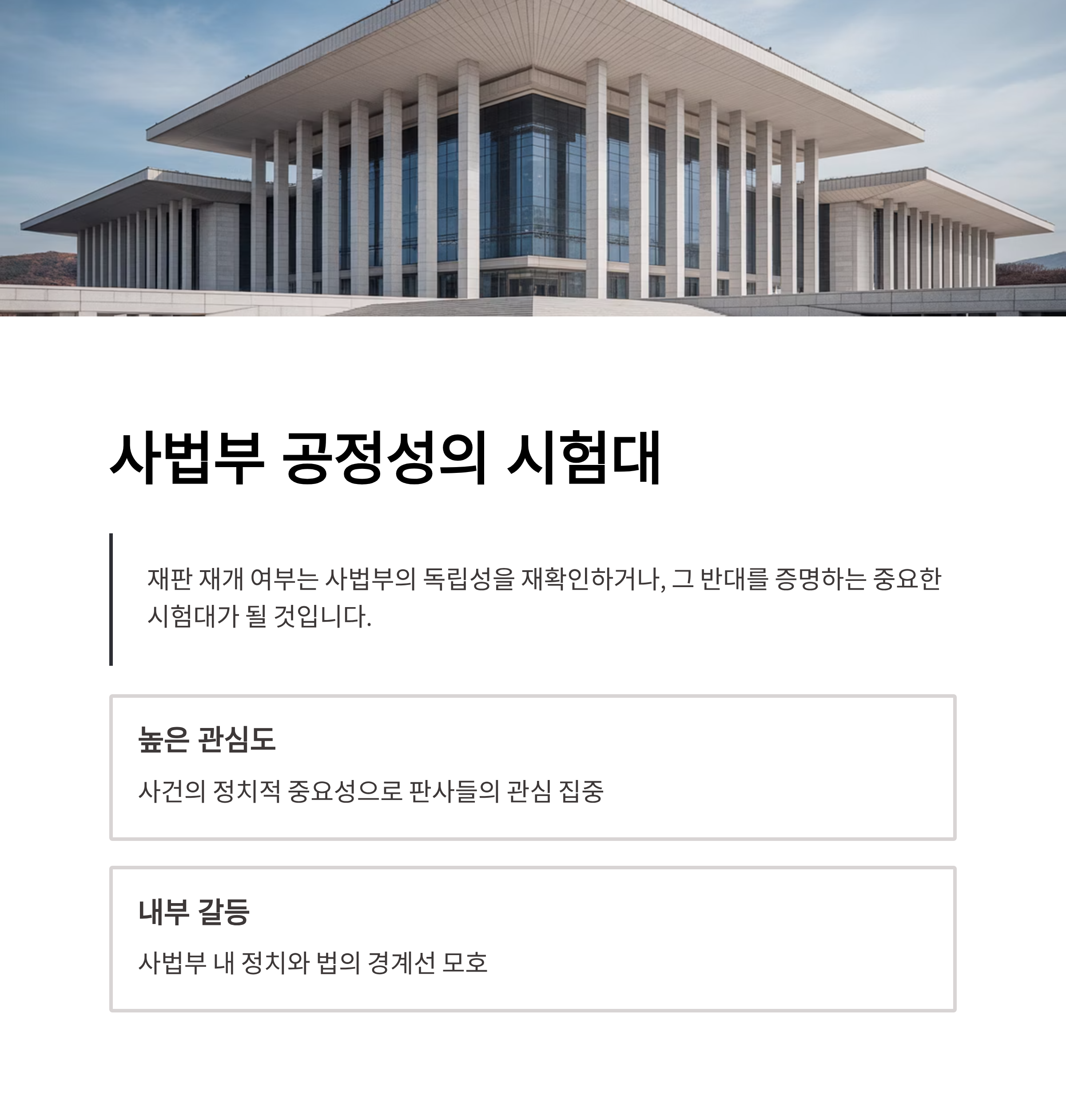 이번 사건은 단지 개인 정치인의 문제가 아닌, 사법부의 공정성에 대한 시험대가 되고 있습니다. 법조계에서는 서울고등법원의 발언 이후 이에 관한 움직임을 예의 주시하고 있습니다. 특히 이재명 사건 재판부를 희망하는 판사의 증가 소식은 큰 이슈로 자리 잡고 있습니다. 이는 단순히 사건의 관심도가 높은 점을 알려줄 뿐 아니라, 사법부 내부에서도 정치와 법의 간극이 존재하고 있음을 시사합니다. 재판 재개 여부는 사법부의 독립성을 재확인하거나, 그 반대를 증명하는 중요한 시험대가 될 것입니다.