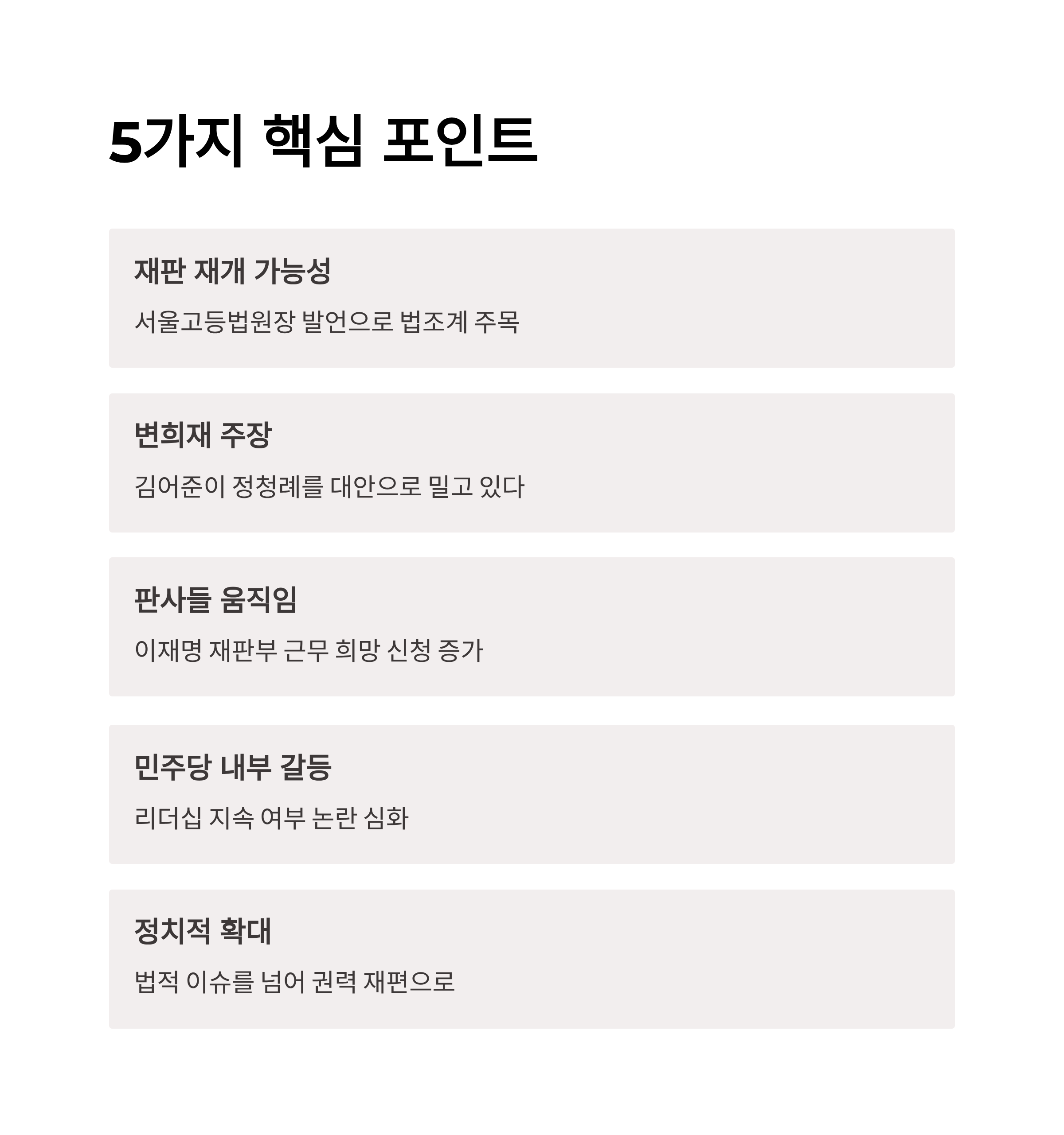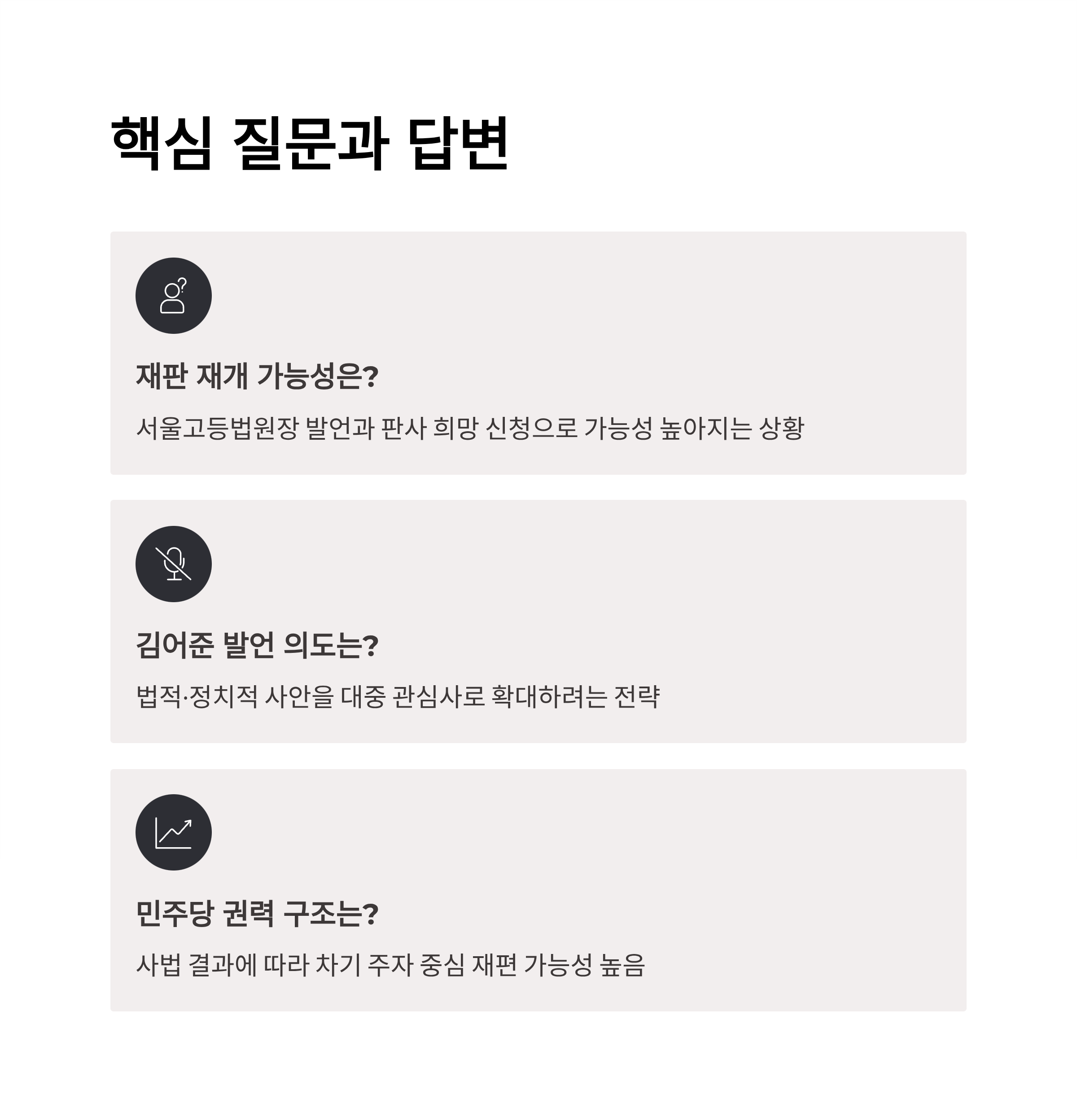 1. 서울고등법원장이 이재명 대표의 재판 재개 가능성을 인정해 법조계와 정치권의 주목을 받았습니다.