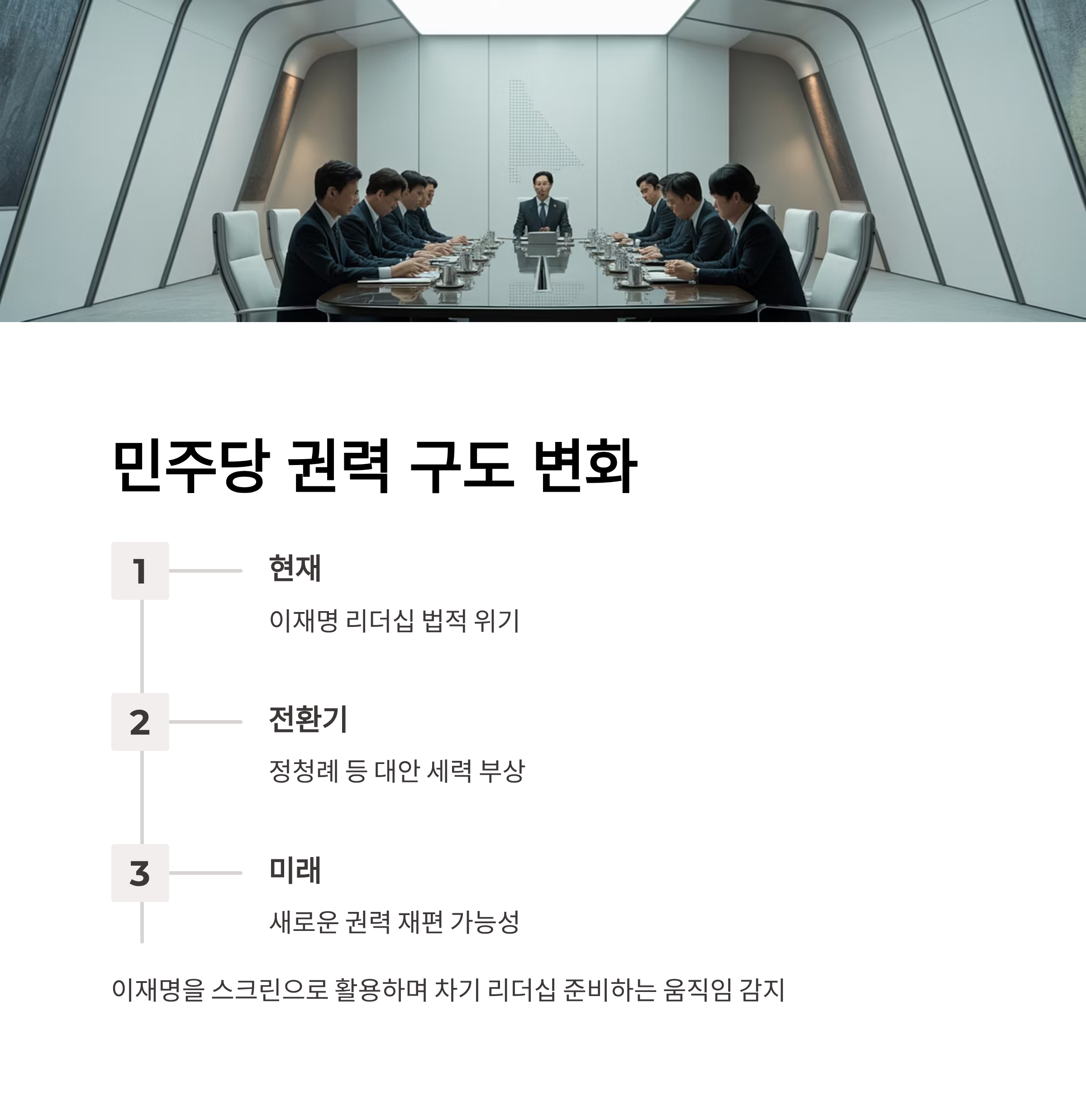 4. 민주당 내부에서는 이재명의 리더십 지속 여부와 대체 리더 가능성을 두고 갈등이 심화되고 있습니다.