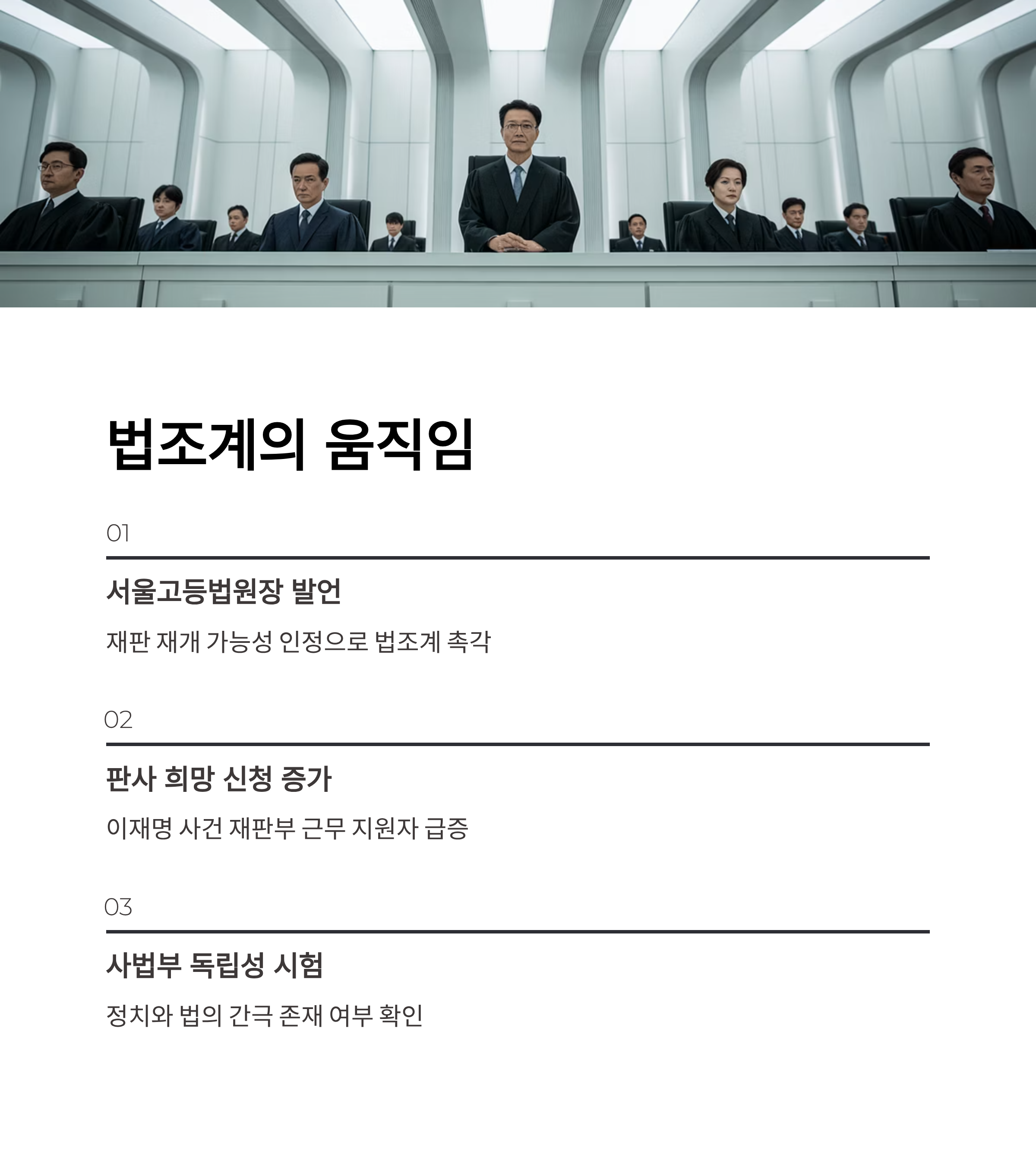 3. 법조계에서는 특정 판사들이 이재명 사건 재판부 근무를 희망 신청하는 등 활발한 움직임이 관측되고 있습니다.