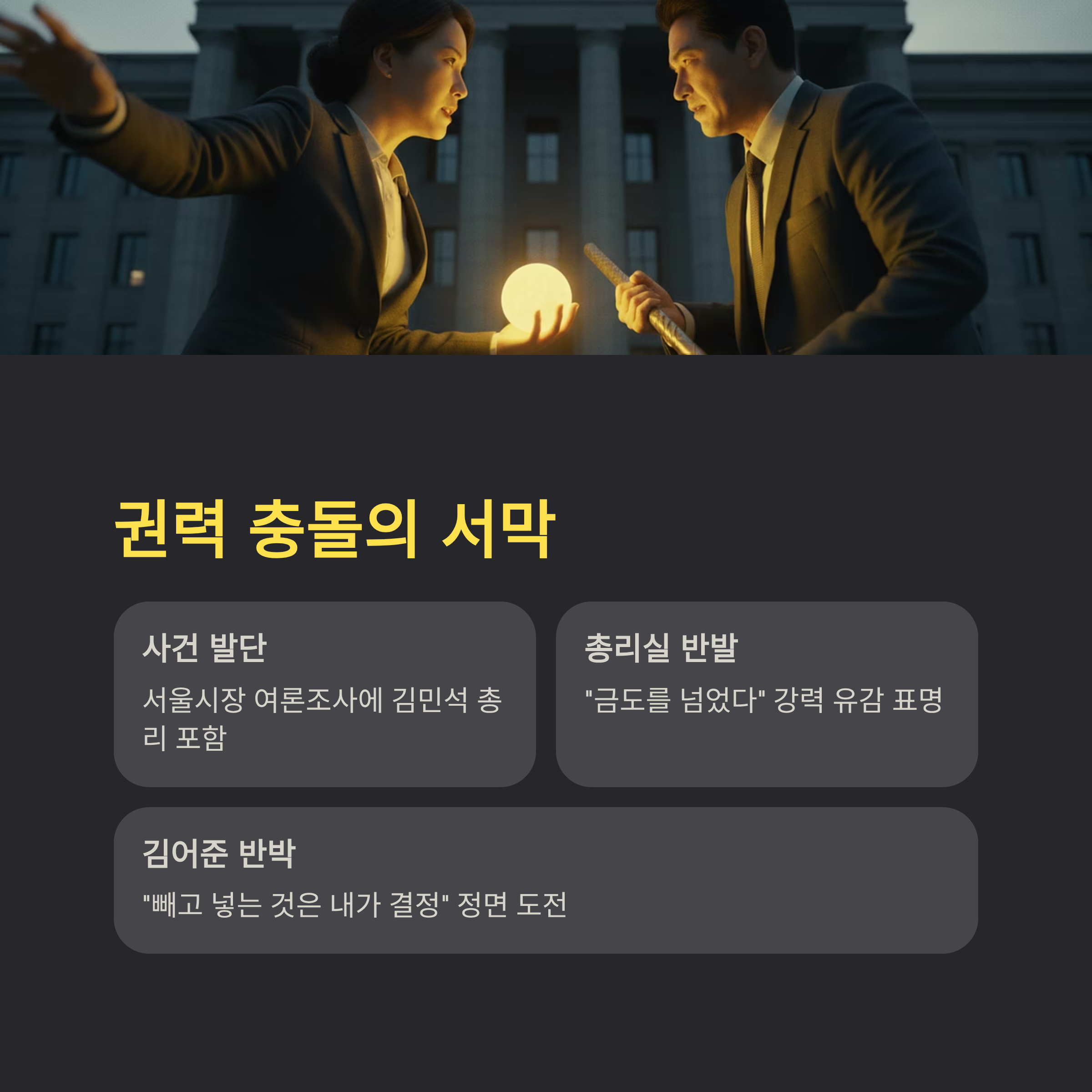2. '존재감' 논리: 김 총리가 출마하지 않더라도 가상 대결에서 1위를 하는 것이 지지층에게 '안도감'을 준다는 논리를 내세워, 자신의 정치적 판단이 정권의 공식 입장보다 우위에 있음을 드러냈습니다.