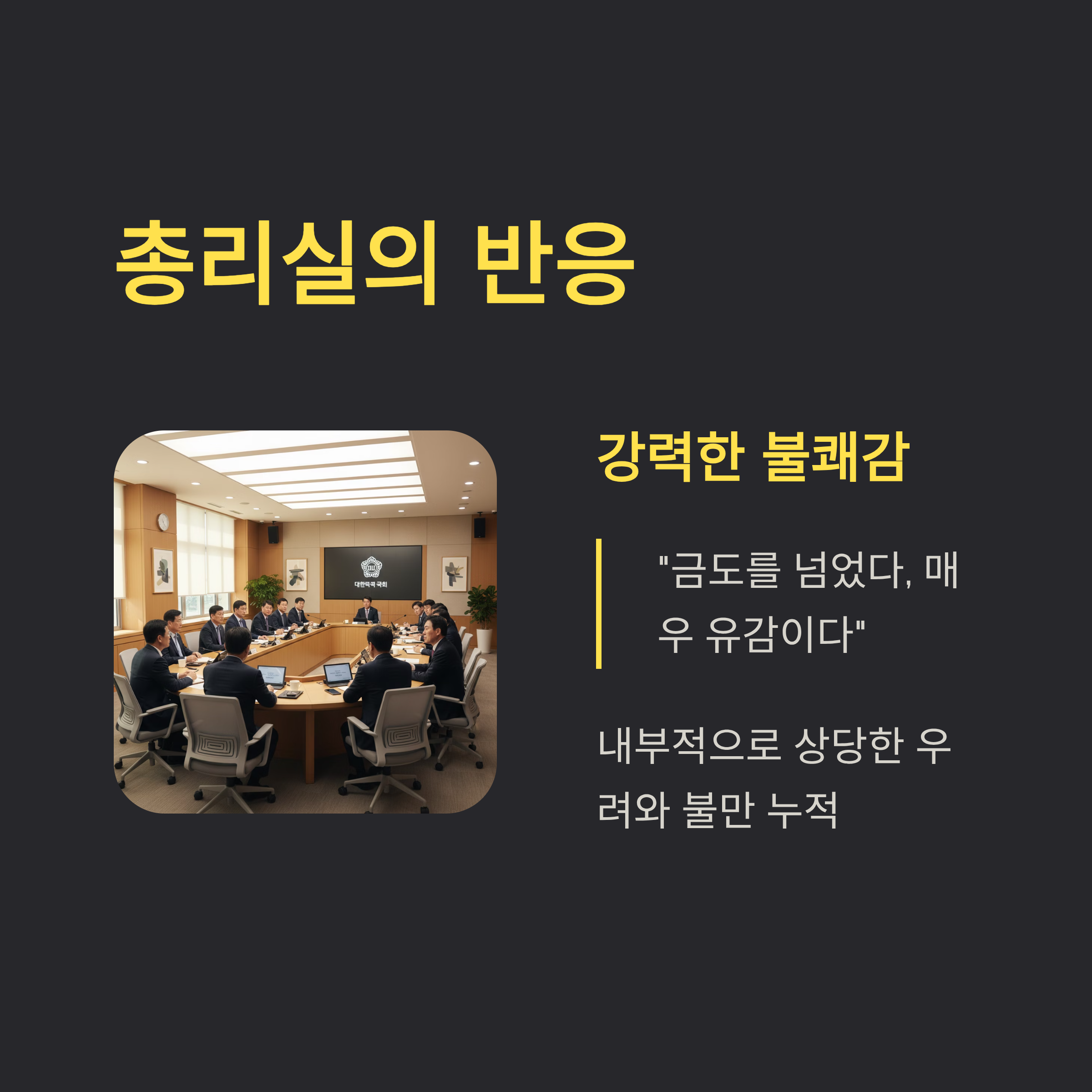 | A3. 매우 부정적입니다. 정권 내부의 위계질서가 무너진 모습을 노출함으로써 대통령의 리더십에 상처를 입힐 수 있습니다. 또한, 핵심 스피커가 정부와 엇박자를 내는 것은 향후 주요 정책 추진이나 선거 국면에서 내부 분열을 야기하여 국정 동력을 약화시키는 원인이 될 것입니다. |