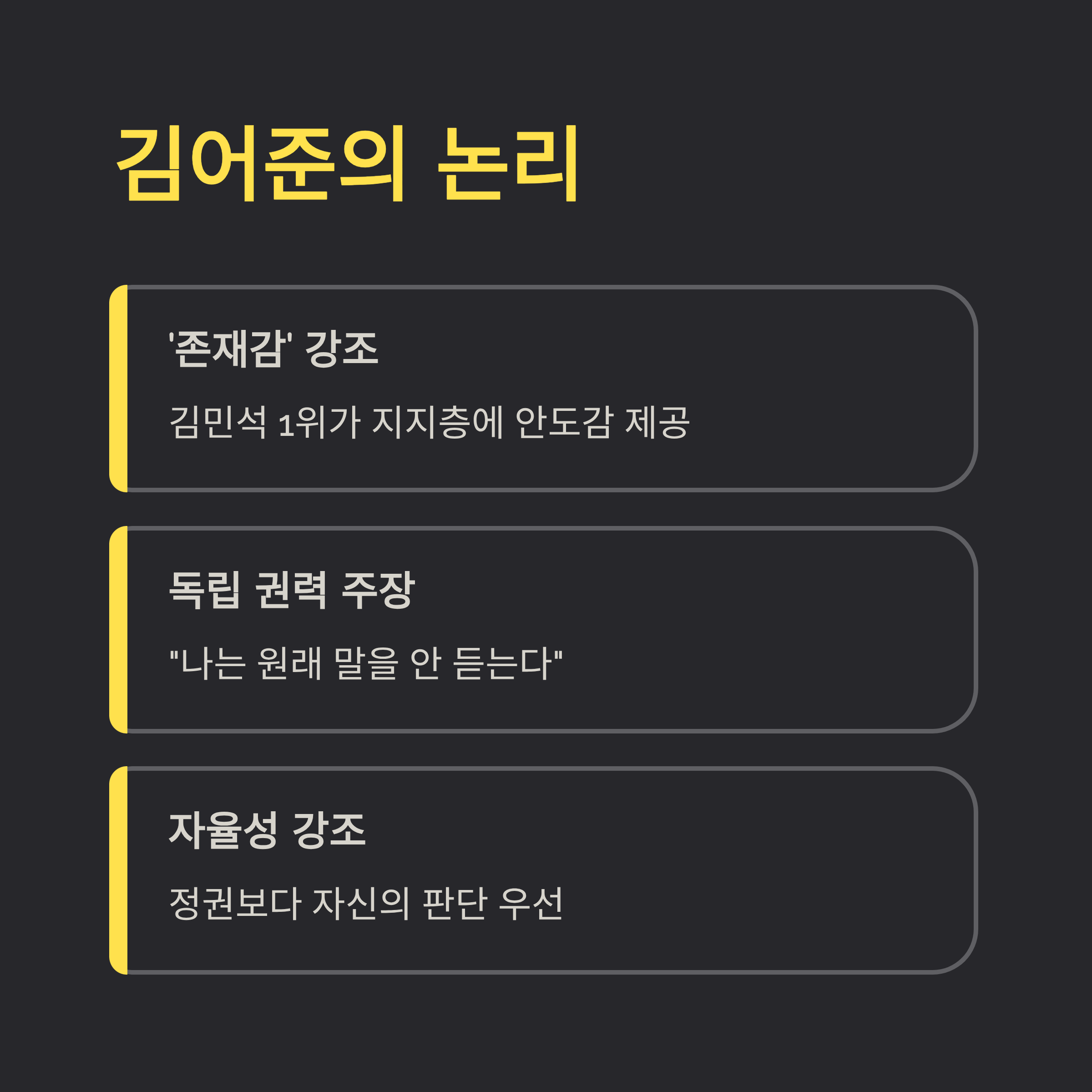 김어준은 과거에도 "나는 원래 말을 안 듣는다"라고 언급한 바 있습니다. 이는 자신이 어떤 정치 세력이나 인물에게도 귀속되지 않는 독립적인 권력 주체임을 강조하는 것입니다. 이재명 정부 출범 이후에도 그는 여전히 상왕(上王)처럼 행동하며, 정부의 공식 입장보다 자신의 해석을 지지층에게 주입하고 있습니다. 이는 지지층 분열을 초래할 수 있으며, 김민석 총리를 넘어 정청래 당 대표나 향후 대권 주자들에게도 "내 뜻을 거스르면 여론전에서 불리해질 수 있다"는 무언의 압박을 가하는 것과 다름없습니다.