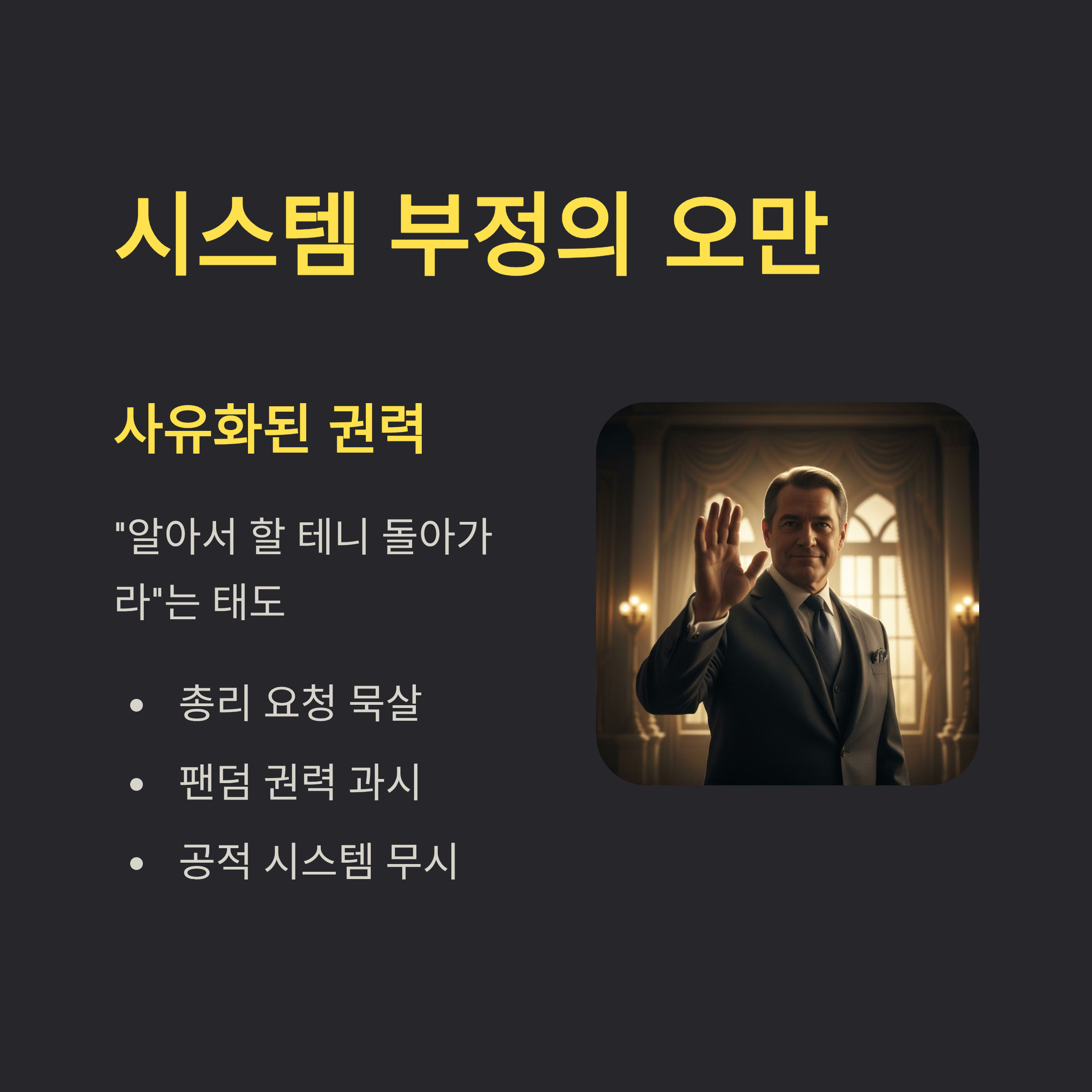 1. '알아서 한다'는 오만: 시스템을 부정하는 사유화된 권력