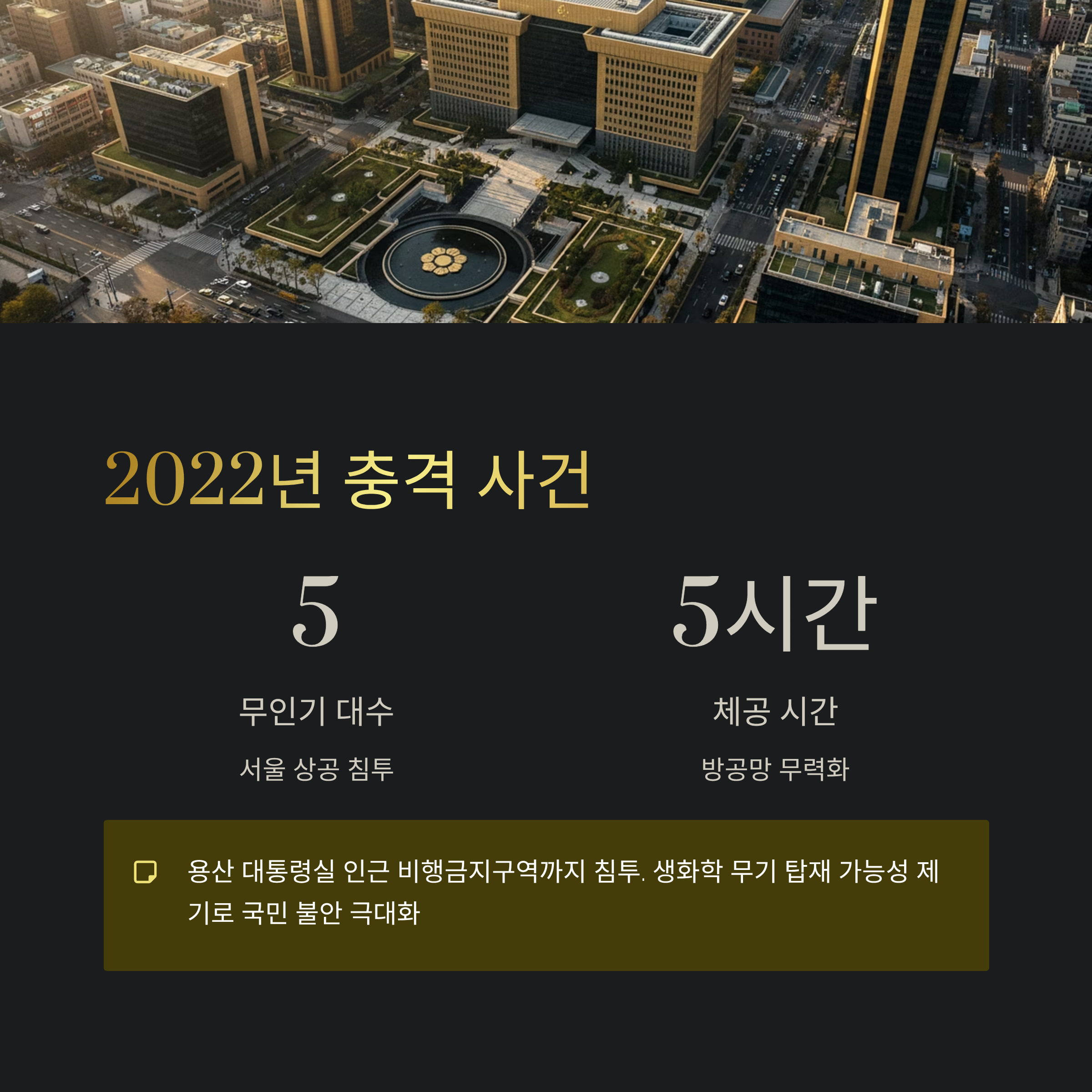 | A. 북한은 2014년부터 파주, 백령도, 서울 용산 등 우리 영공을 수차례 침범했습니다. 청와대와 사드 기지를 촬영하는 등 명백한 정찰 및 도발 행위를 했지만, 단 한 번도 자신들의 소행임을 인정한 적이 없습니다. |