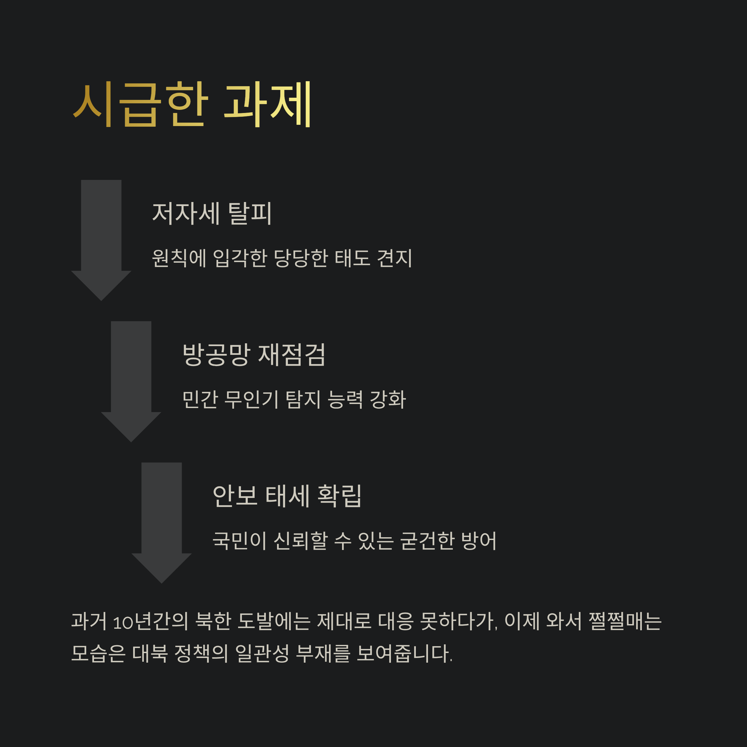 과거 10년간 이어진 북한의 무인기 도발에는 제대로 대응하지 못하다가, 이제 와서 북한의 주장에 쩔쩔매는 모습은 대북 정책의 일관성 부재를 보여줍니다. 정부는 지금이라도 굴욕적인 저자세에서 벗어나 원칙에 입각한 당당한 태도를 견지해야 합니다. 또한, 이번 사건을 계기로 민간 무인기조차 탐지 못 할 수 있다는 방공망의 허점을 재점검하고, 국민이 신뢰할 수 있는 굳건한 안보 태세를 확립하는 것이 무엇보다 시급한 과제입니다.
