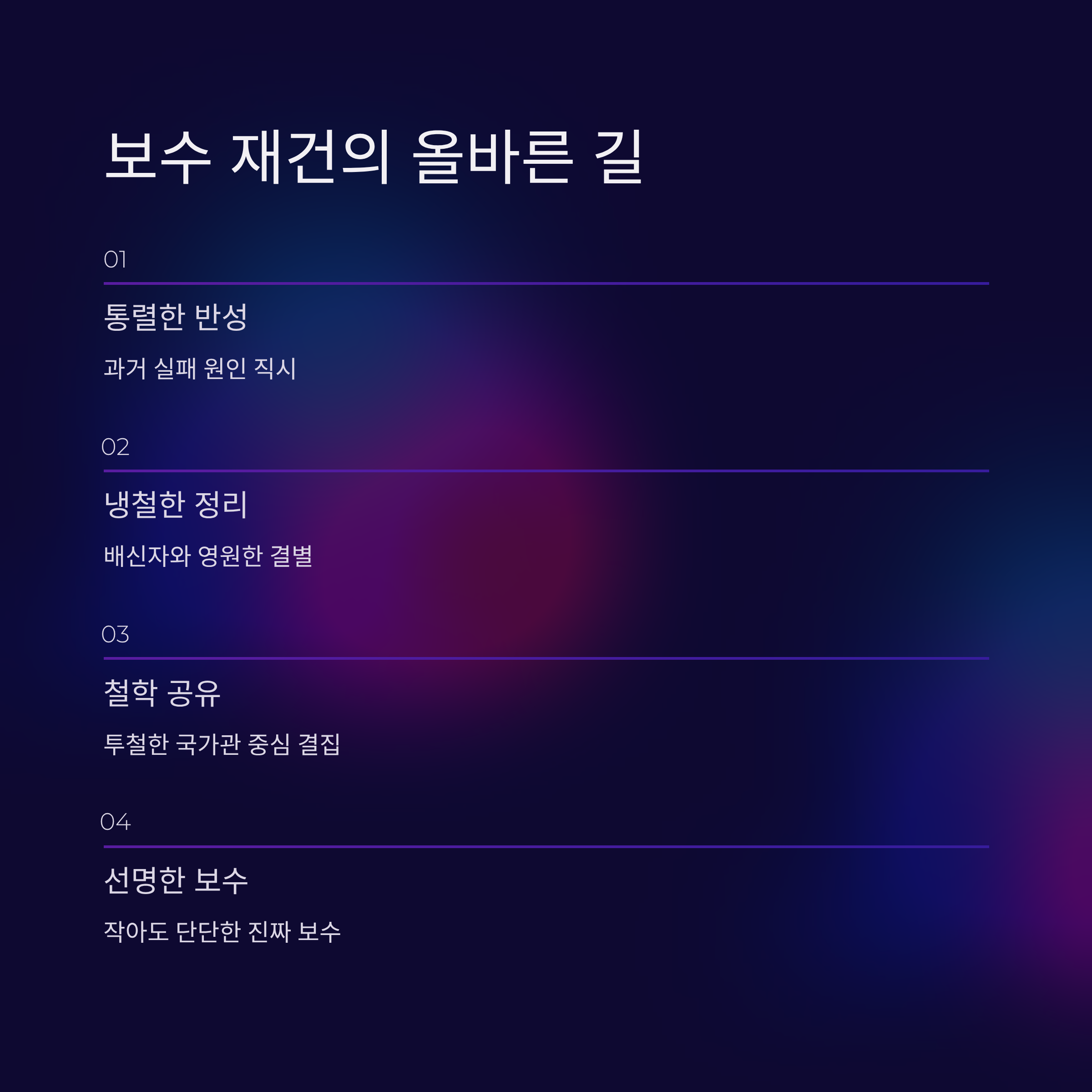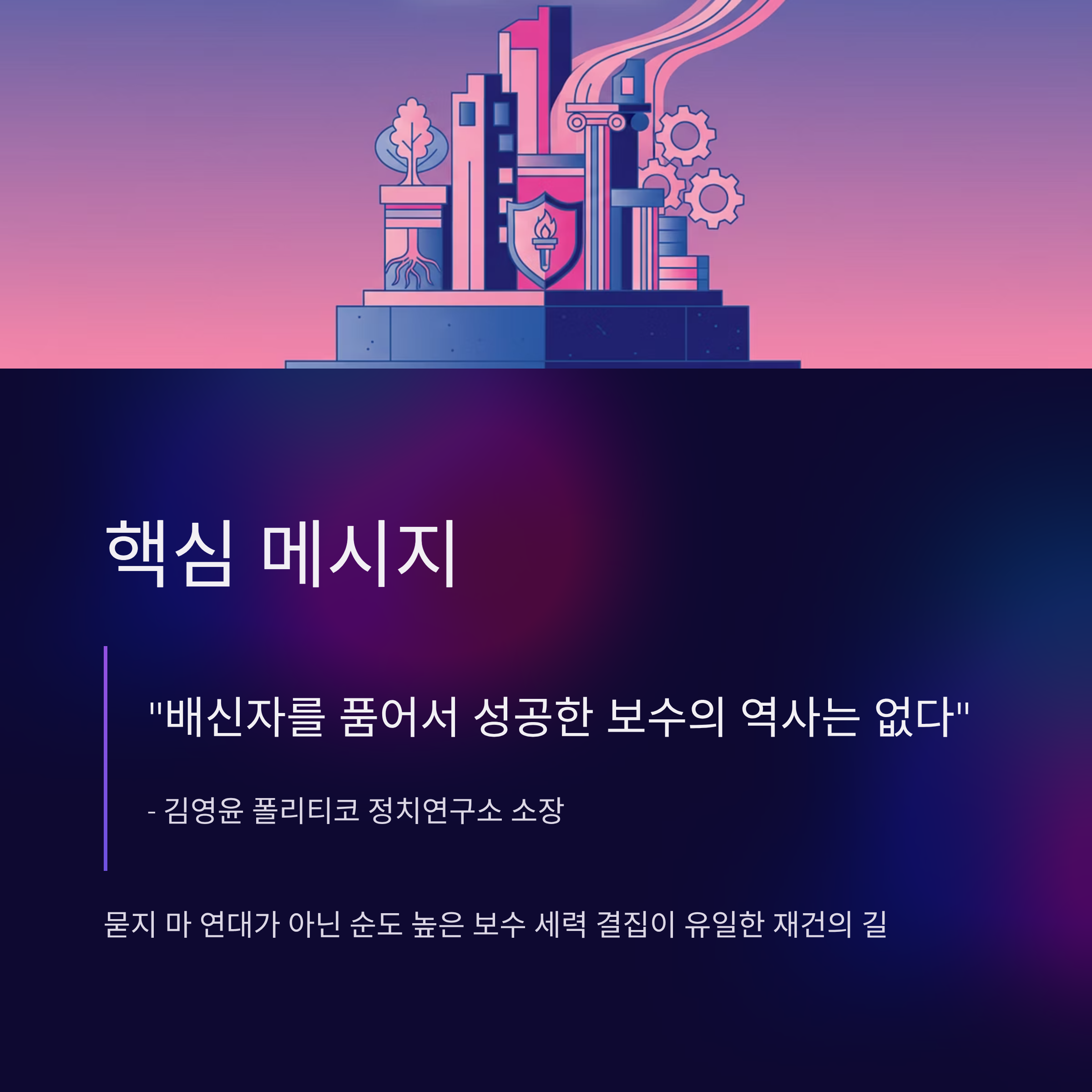 결론적 제언: 지금은 외연 확장이 아닌 내부 정리의 시간이며, 같은 방향을 바라보는 '순도 높은 덩어리'만이 보수 재건의 희망입니다.