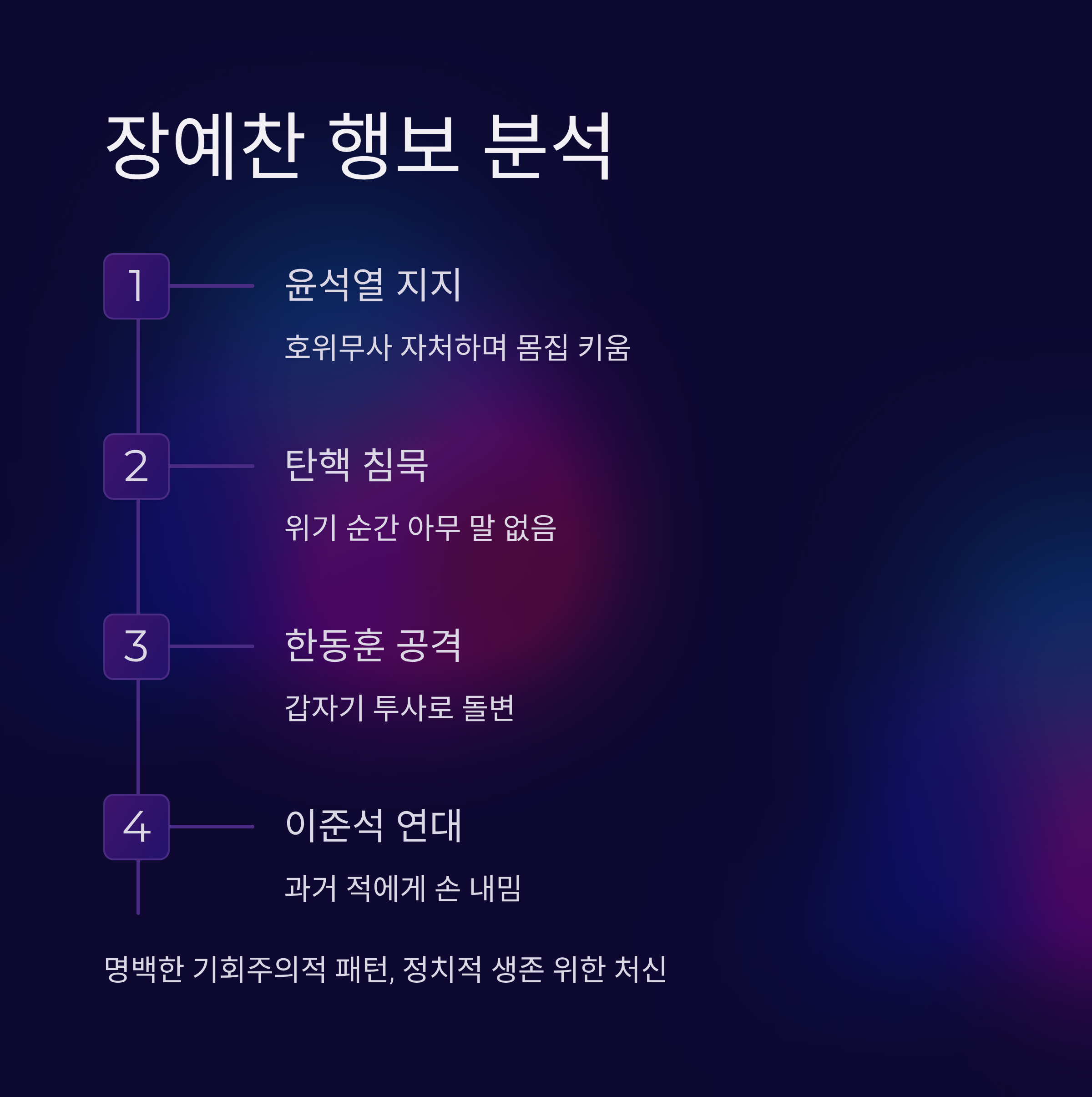 장예찬의 패턴 분석: 윤석열 대통령을 지키겠다던 장예찬이 결정적인 탄핵 국면에서는 침묵하다가, 최근 한동훈 공격의 선봉에 서며 이준석과 보조를 맞추는 기이한 행보(패턴)를 보이고 있습니다.